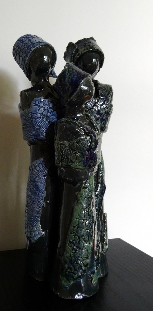 Een groepje van 3 vrouwen die aan elkaar verbonden zijn. Alle drie de vrouwen hebben 'kleding' met kant bewerkt. 2 in een groen blauwe kleur en 1 in blauw waarbij de kant afdruk zeer duidelijk zichtbaar is.