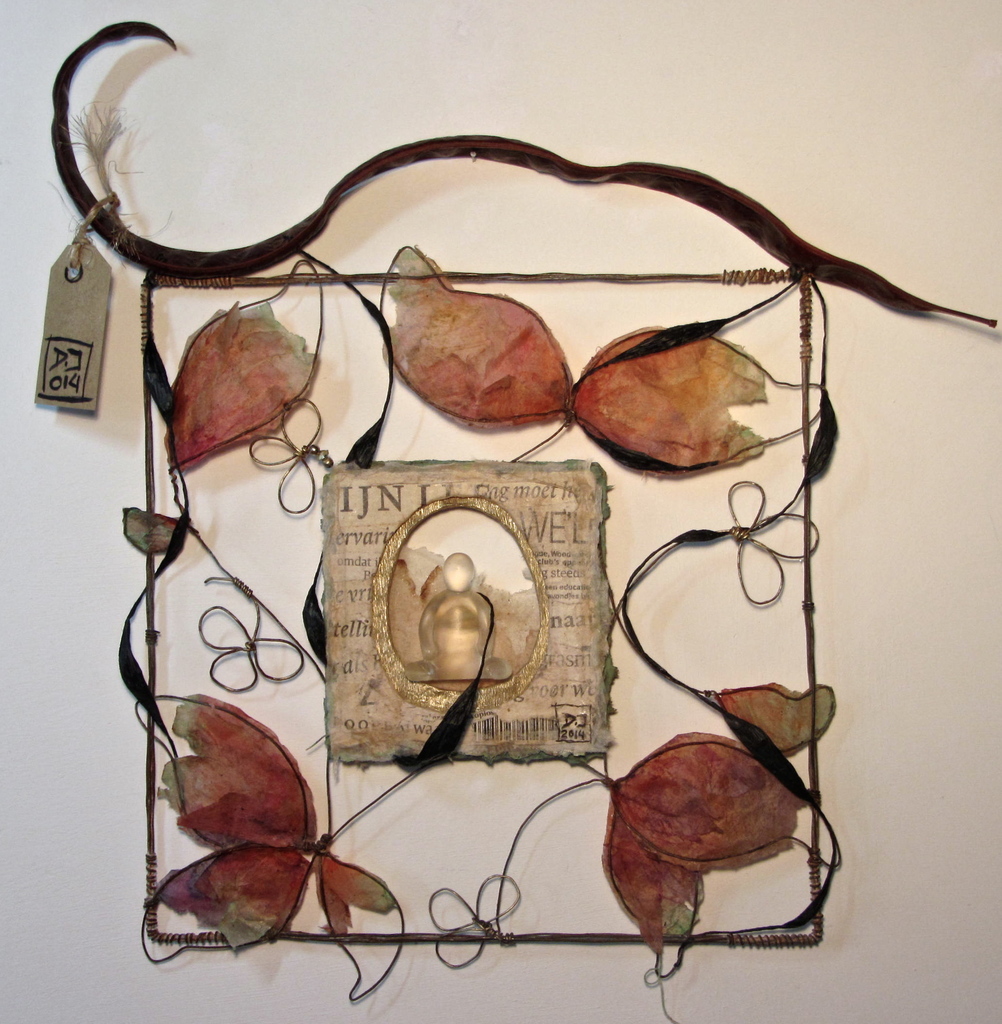 ZAZEN WireWorks series - 2006-2014. Experimenteel assemblage werk dit keer met voornamelijk theezakjes, knipsels en een mooie grote peul van de Valse Christusdoorn boom. Het geheel is wat gebogen en heeft een diepte van 4 cm.