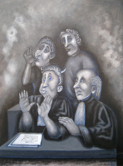 Als kunstenares heb ik een reeks schilderijen gecreerd met thema: rechters, advocaten en hun klanten. 'De gerechtelijke reeks van Cassou' wordt in Gerechtsgebouwen tentoongesteld. Humor, kleuren, geestigheid.
