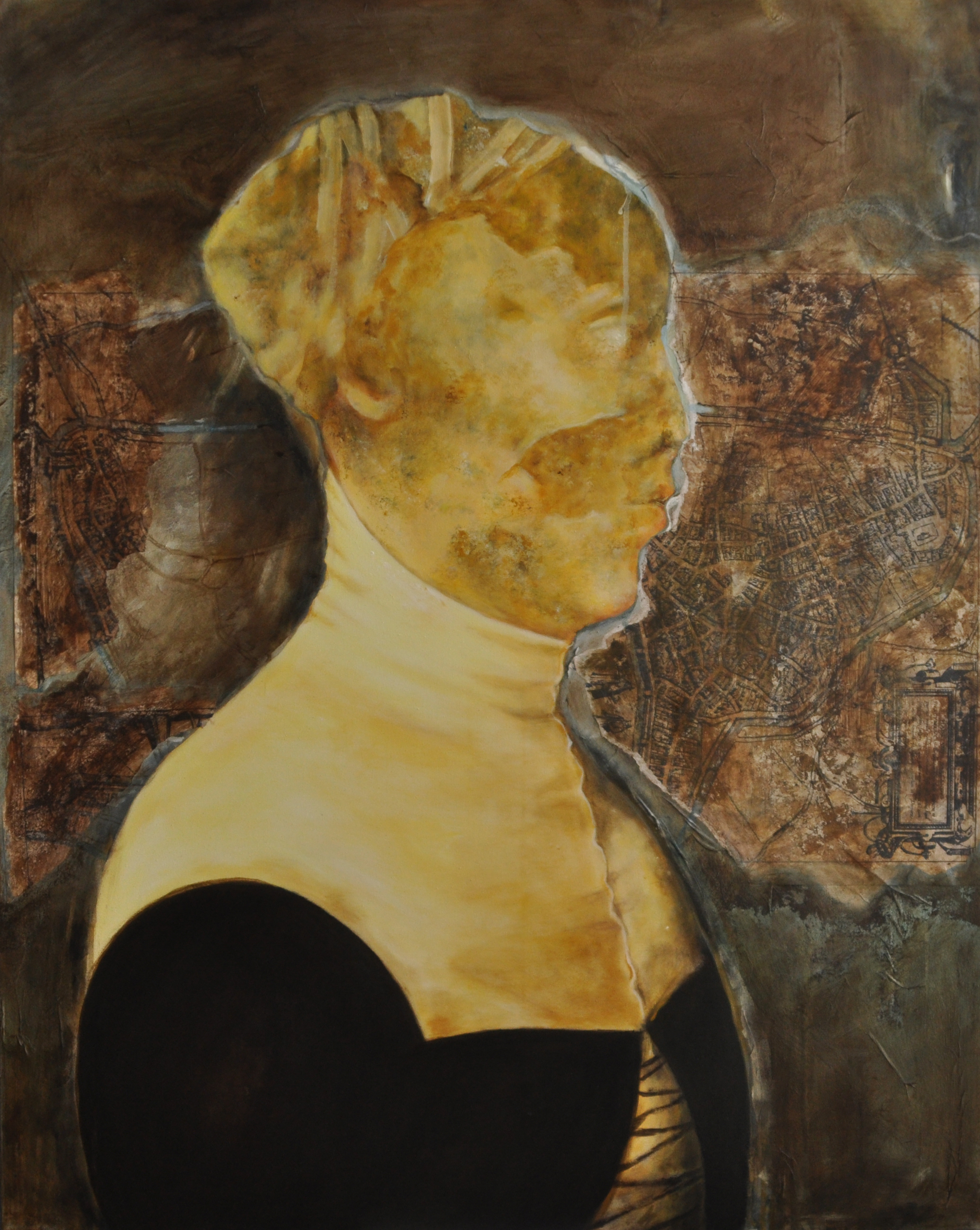 Historische documenten, (delen van) geschilderde portretten, oude familiefoto's en brieven, oude landkaarten en stadsgezichten, zijn elementen die steeds in mijn werk terugkomen. Deze elementen zijn het uitgangspunt, waarbij figuratie en abstractie gecombineerd worden.. In het latere werk ( o.a. in de serie Budapest) is het uitgangspunt en inspiratiebron mijn familiegeschiedenis. Ik verwerk hierin vaak portretfoto's, stadsgezichten en plattegronden van het oude Budapest, teksten en documenten en er ontstaat zo uiteindelijk een beeld van voorbije tijd, weemoed, verlatenheid en leegte en van ' de dingen die geweest zijn'. Dat wat overblijft zijn enkel fragmenten van wat eens gaaf, heel en levend was. De schoonheid van het vergankelijke. Omnia mutantur, nihil interit ( Ovidius) - Alles v