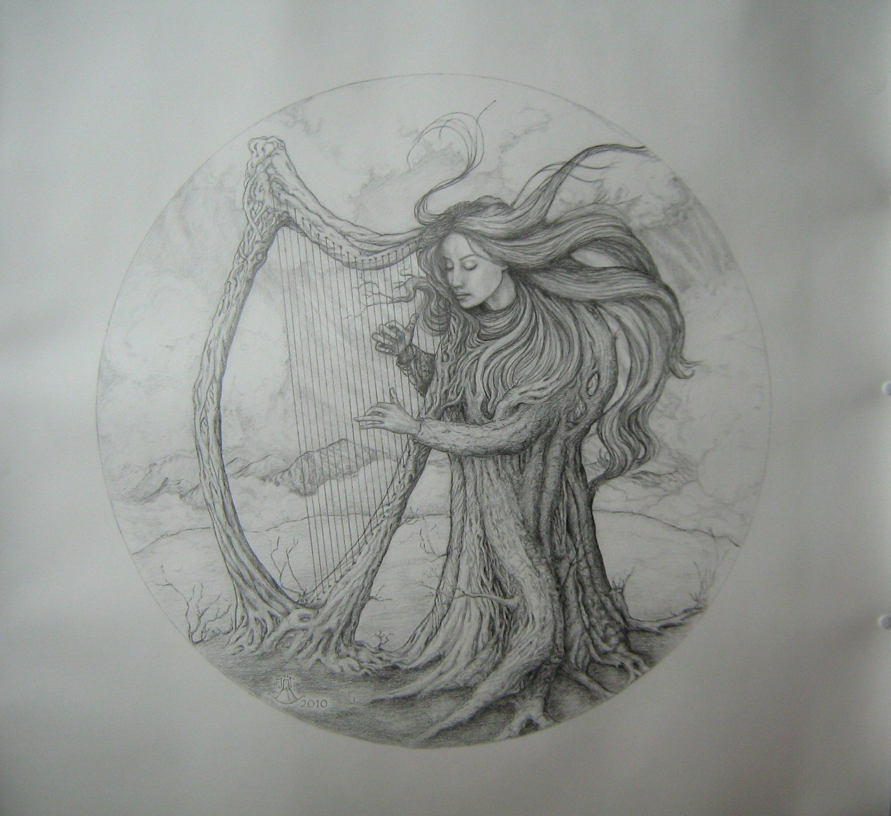 Vrouw Potlood Woman Tekening Boom Drawing Muziek Tree Harp Music Pencil Tondo Roundel