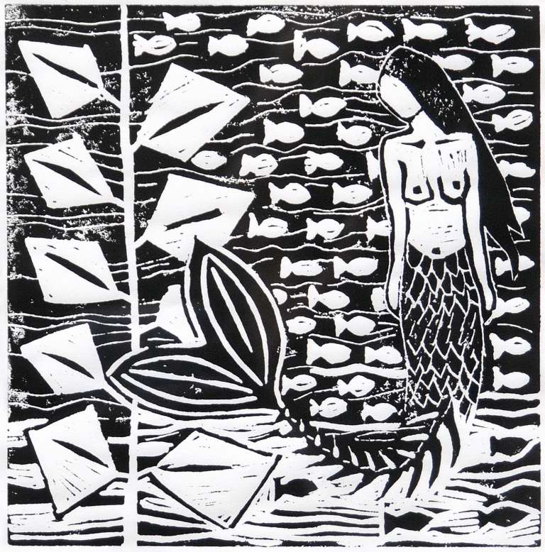 Zwart Black Lino Zeemeermin Mermaid Linoleum Cutting