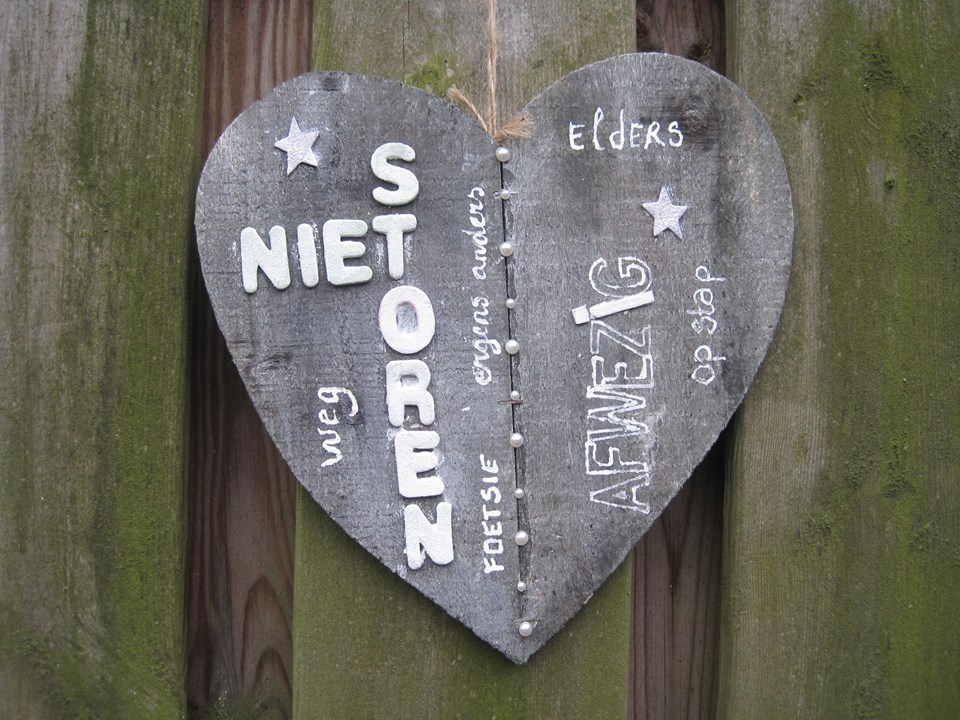 Houten hart met witte letters en tekst "niet storen"