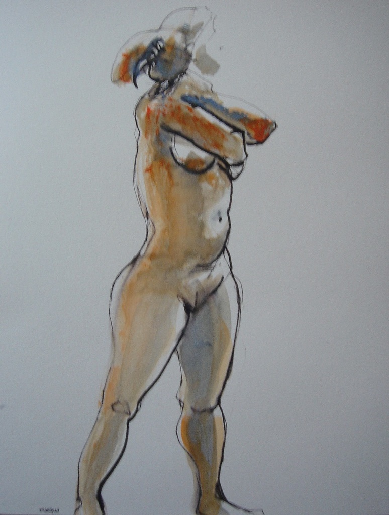 Staande naakte vrouw. Getekend met inkt en geschilderd in acrylverf op stevig aquarelpapier 27x35 cm. Blauw, bruin, zwart, wit tinten.