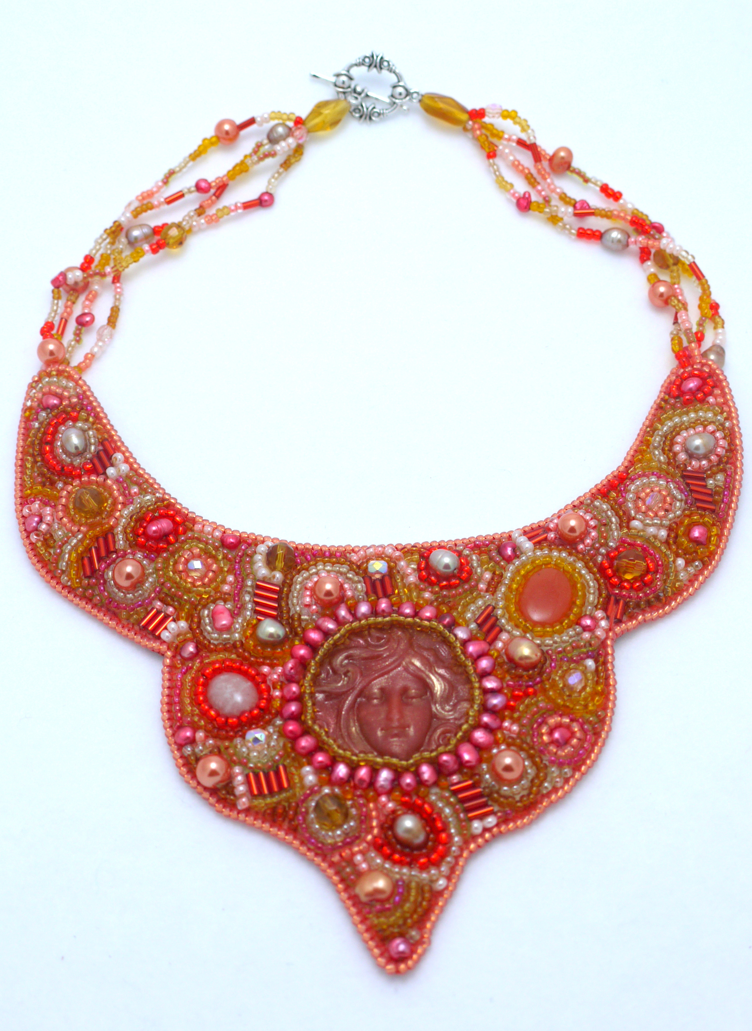 Halssieraad met cabochon van polymeer klei, Carneool, Agaat en diverse glazen pareltjes en kraaltjes. Achterzijde is bekleed met zachte Ultra-Suede.