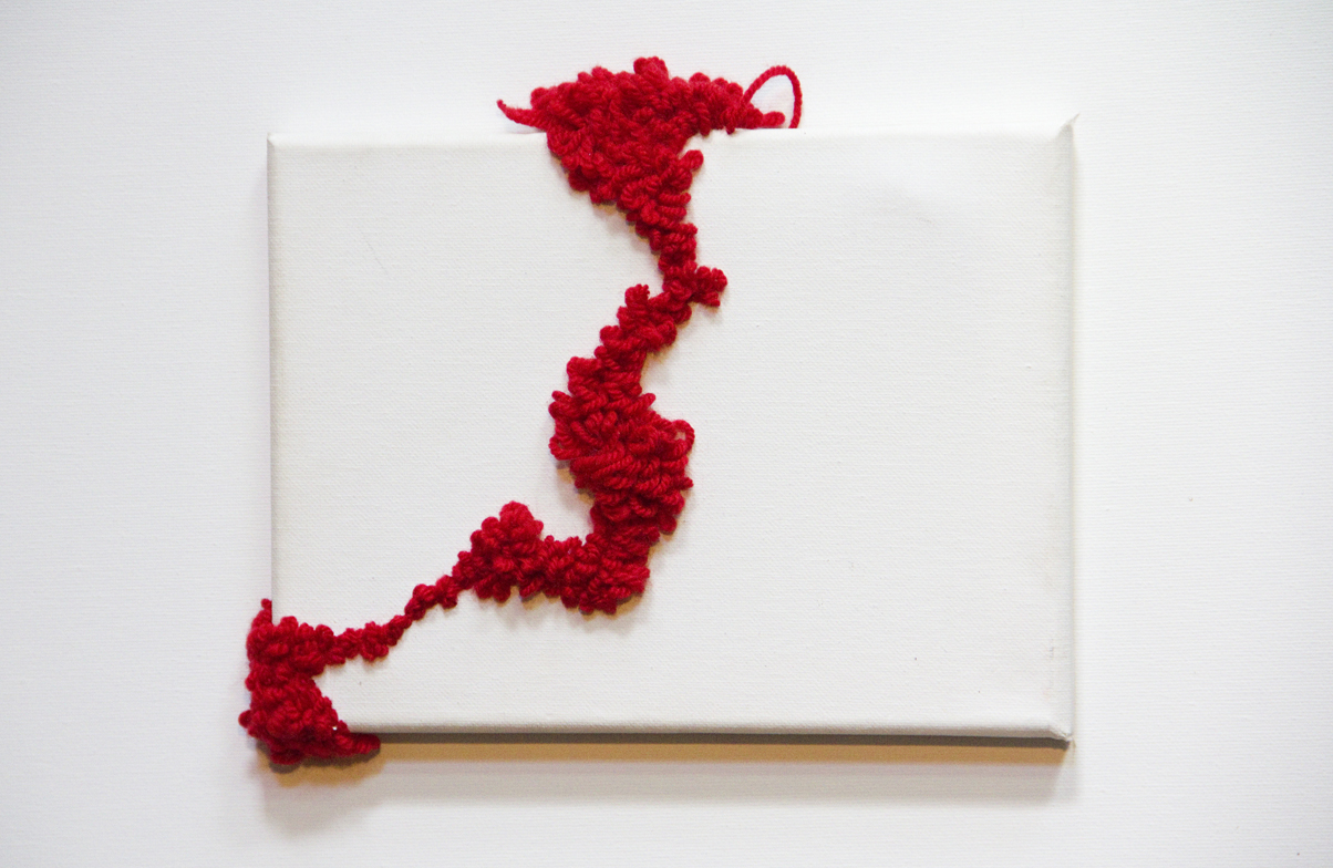 Red is een reliëf op doek. Hierin zoek ik een goeie balans tussen het doek en het reliëf. In dit werk ben ik bezig om vanuit het platte vlak de ruimte in te gaan.