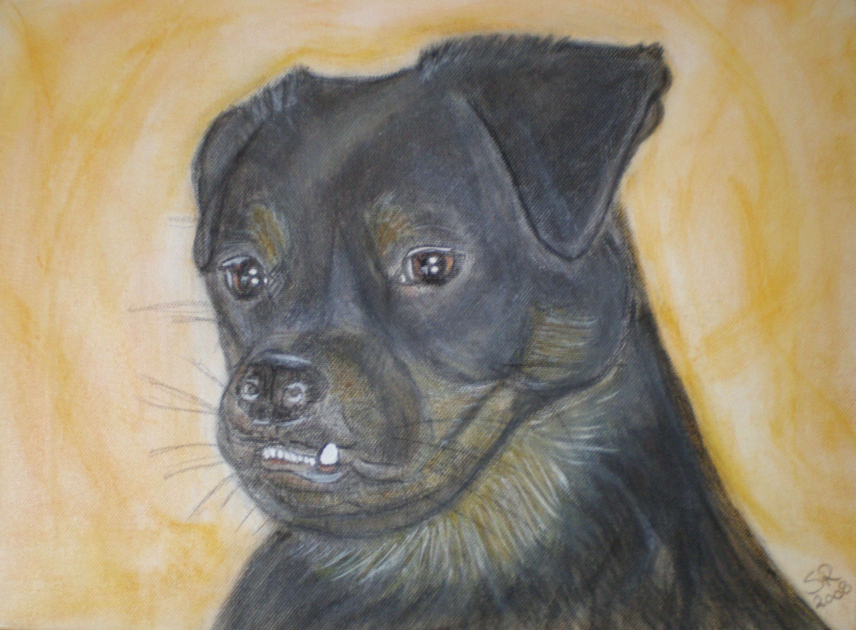 Dit hondje heb ik in opdracht geschilderd, vooral dat ene tandje!!!!!
