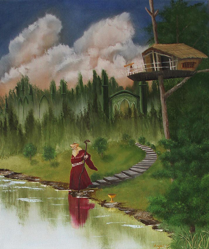 Merlin's Castle heeft heel veel details die in eerste instantie niet eens zo in het oog springen. Zo is er het verborgen kasteel in het bos, maar ook Ogham tekens links voor de bomen. Het Ogham boomorakel wordt normaal op stokjes geschreven en elk stokje is afkomstig van de boom waar het voor staat. Als voorbeeld is het stokje met het symbool voor meidoorn van meidoornhout, die voor eik van eikenhout enzovoorts. Het hoort ook bij druïden, en daarmee bij Merlin, en dus op het schilderij. Dan is er de telescoop op de boomhut en de gouden bokaal bij Merlijn. Merlijn draagt een rode robe. Rood is een hele sterke, energetische kleur, dit versterkt hem. Hij is hier thuis, dus opvallen is geen punt. Normaal wordt hij in blauw afgebeeld, wat ook past bij zijn energie die electriserend blauw is. Het gehele werk is intuïtief ontstaan.