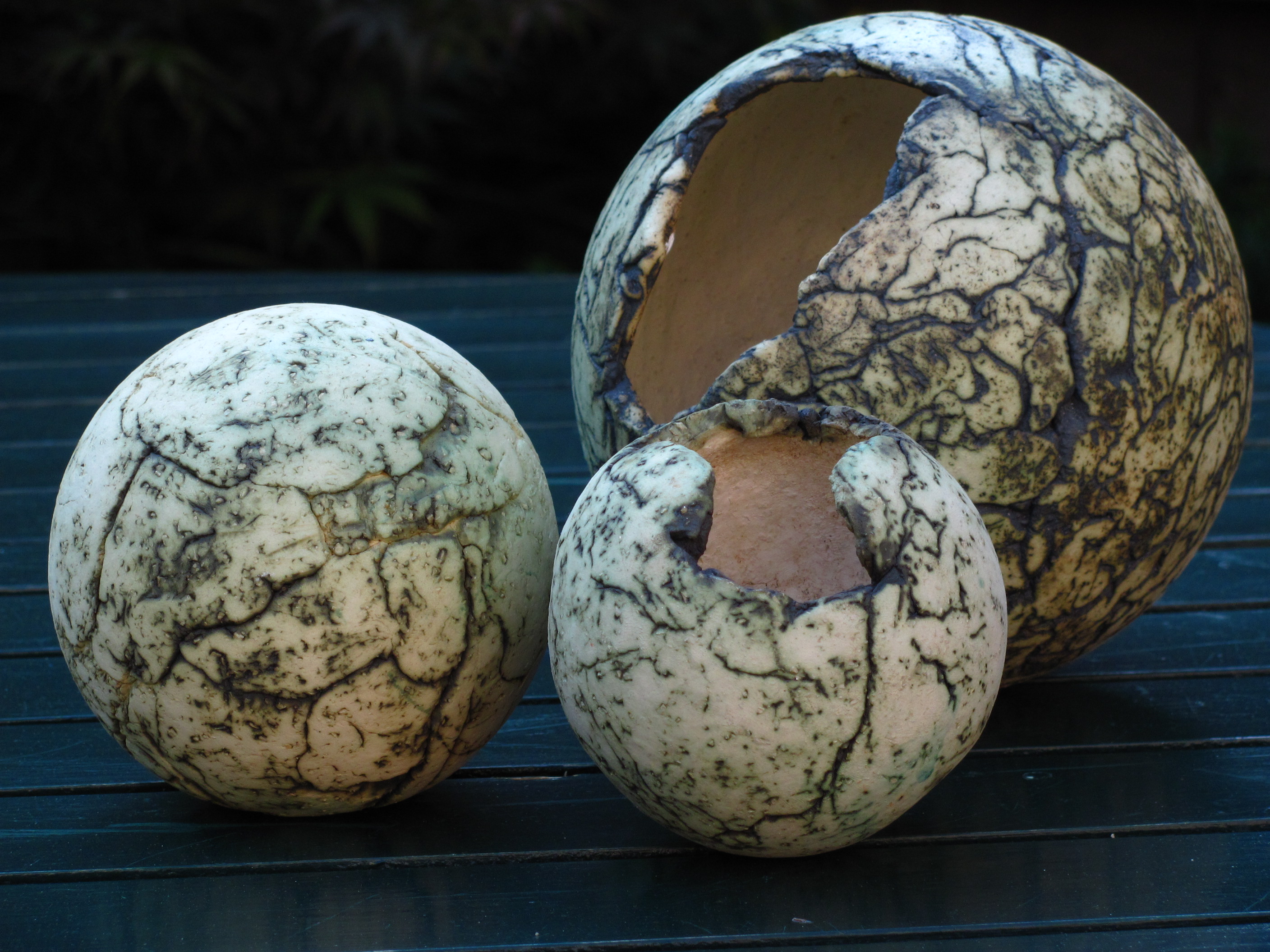 Deze potten zijn gemaakt van grove klei en met een koperoxyde bewerkt