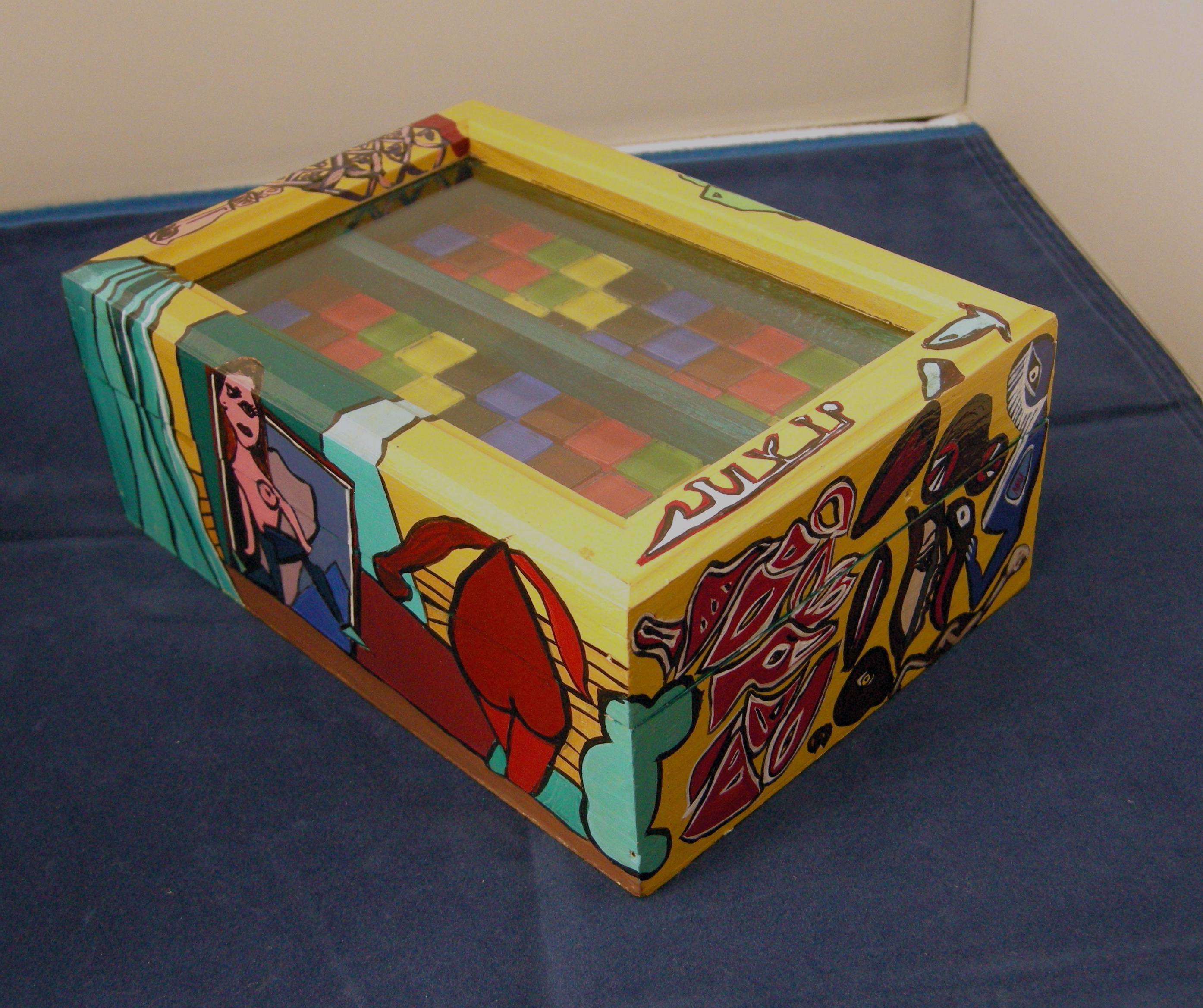 Een kistje geschilderd in de stijl van Picasso. Het deksel is meteen een etalagevenster waarin mozaikglassteentjes liggen. In het kistje zelf kun je je eigen schatten bewaren.