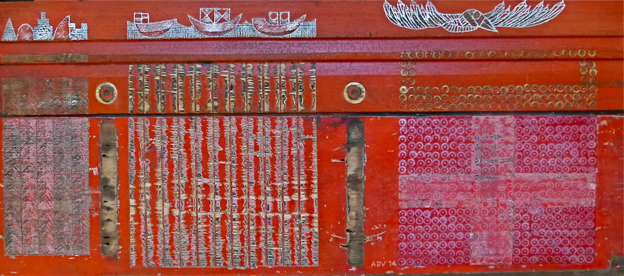 Twee samengevoegde kastplanken. Oorspronkelijke kleur rood. Bewerkingen met boormachine, priem en verfkrabber. Toegevoegde kleuren: wit en rood.