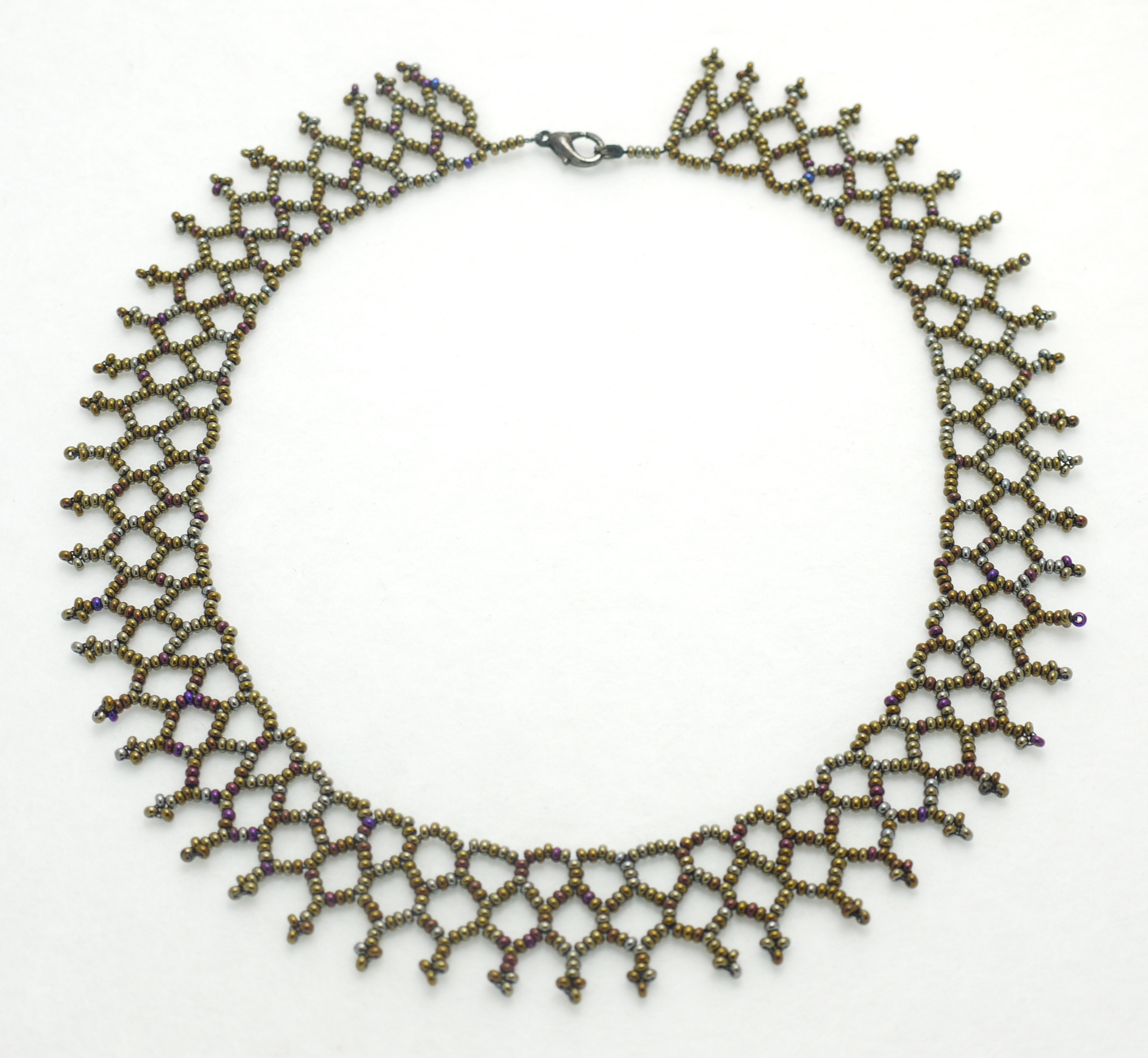 Donker brons kelurige ketting. Zwarte metalen sluiting.