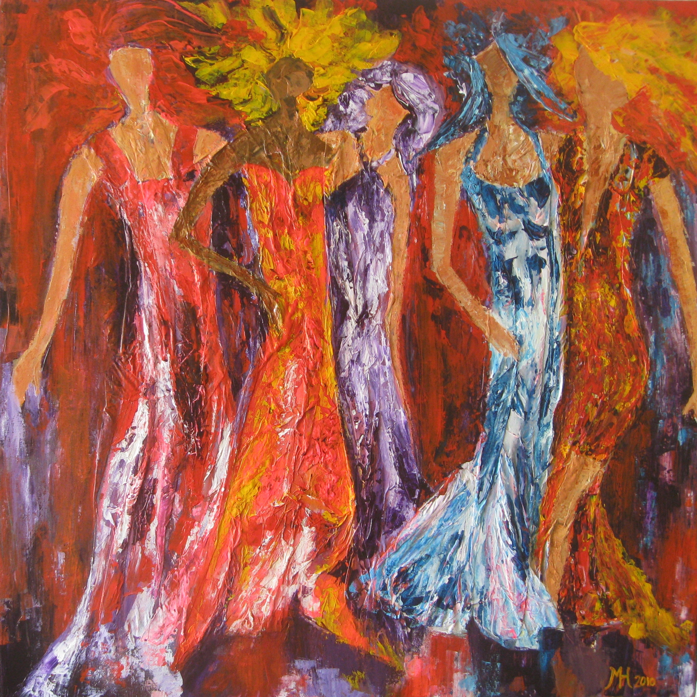 Vijf vrouwen, op weg naar een feestje