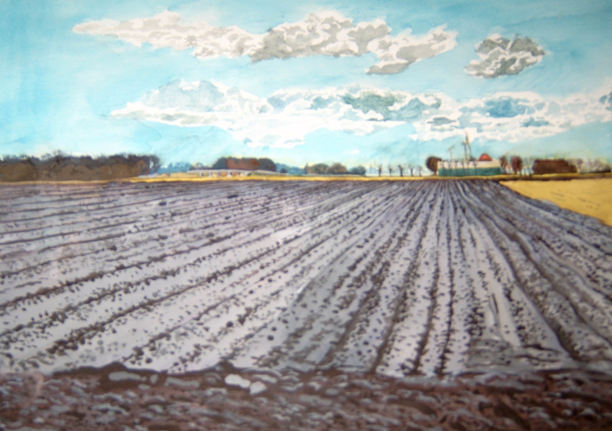 Ontgonnen grond in de Wieringermeer,Noord-Holland. Aquarel op papier.