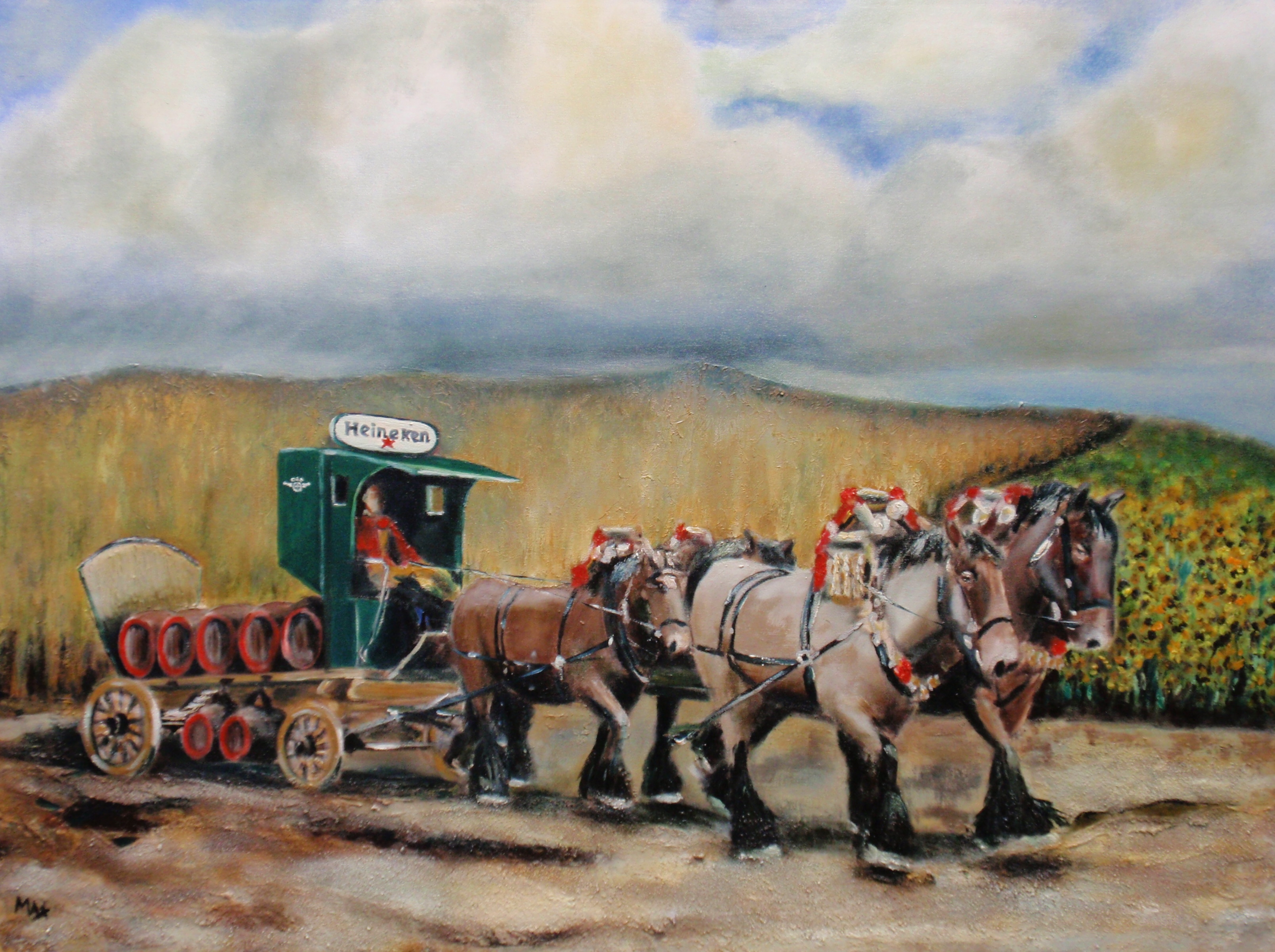 Wat een kracht 4 Belgisch Trekpaarden , die een lading vaten bier van de bier brouwerij Heineken transporteren door heel Nederland. ook in zeefdruk te koop