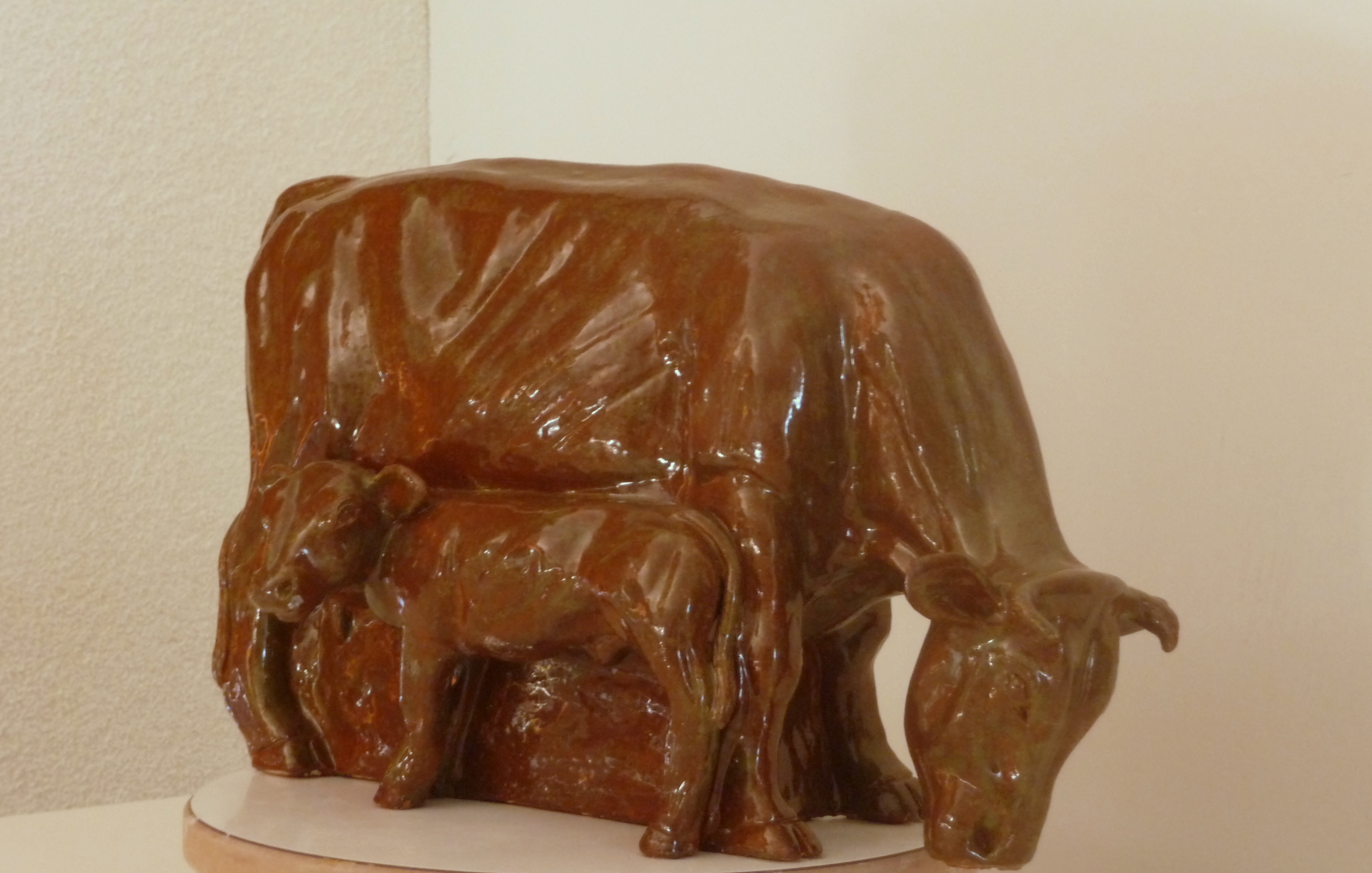 staande koe met kalf, handgevormd, klei, gestookt op 1060º, geglazuurd herfstbruin glanzend