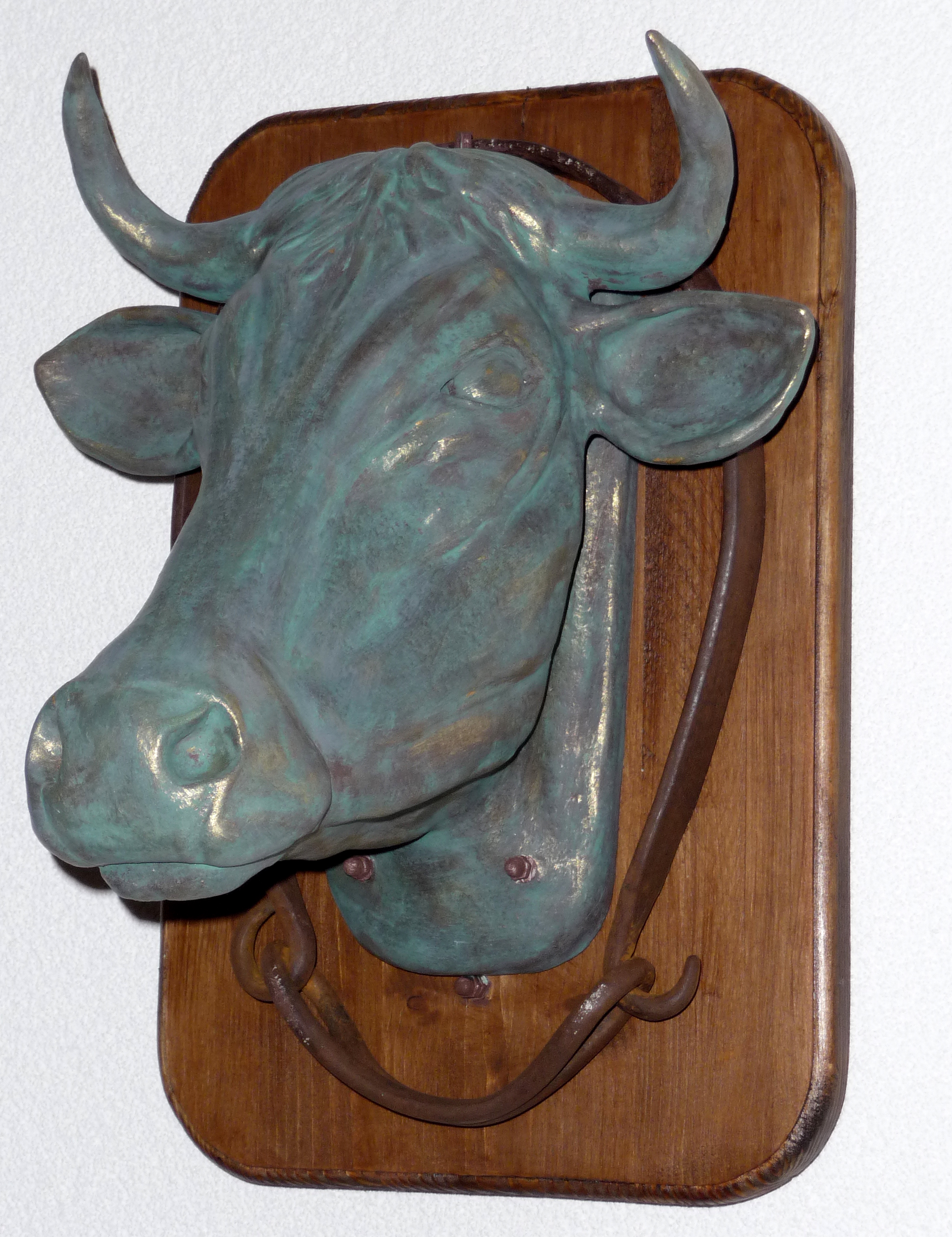 hangende koeienkop, klei, biscuit gebakken 1060º, brons acrylbeschilderd.