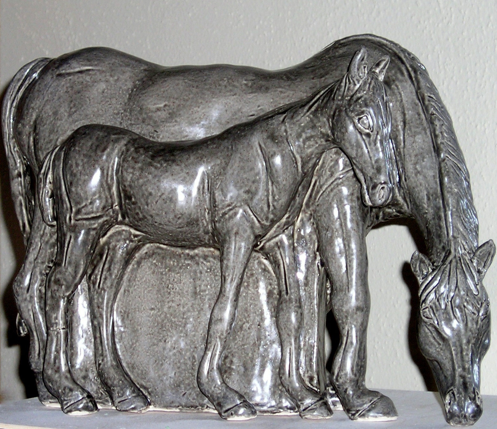paard met veulen, klei, handgevormd, gestookt op 1060º, geglazuurd grijs/bruin zijdeglans