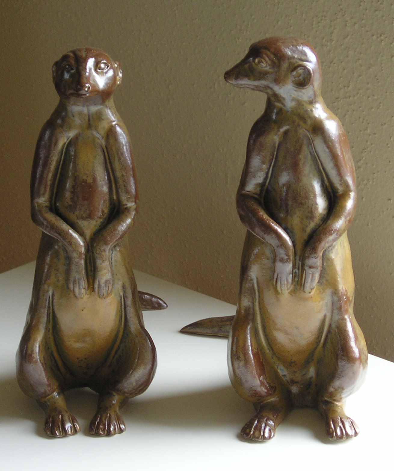 stokstaartjes, handgevormd, klei, gestookt 1220º, weerbestendig, klei, geglazuurd bruin zijdeglans