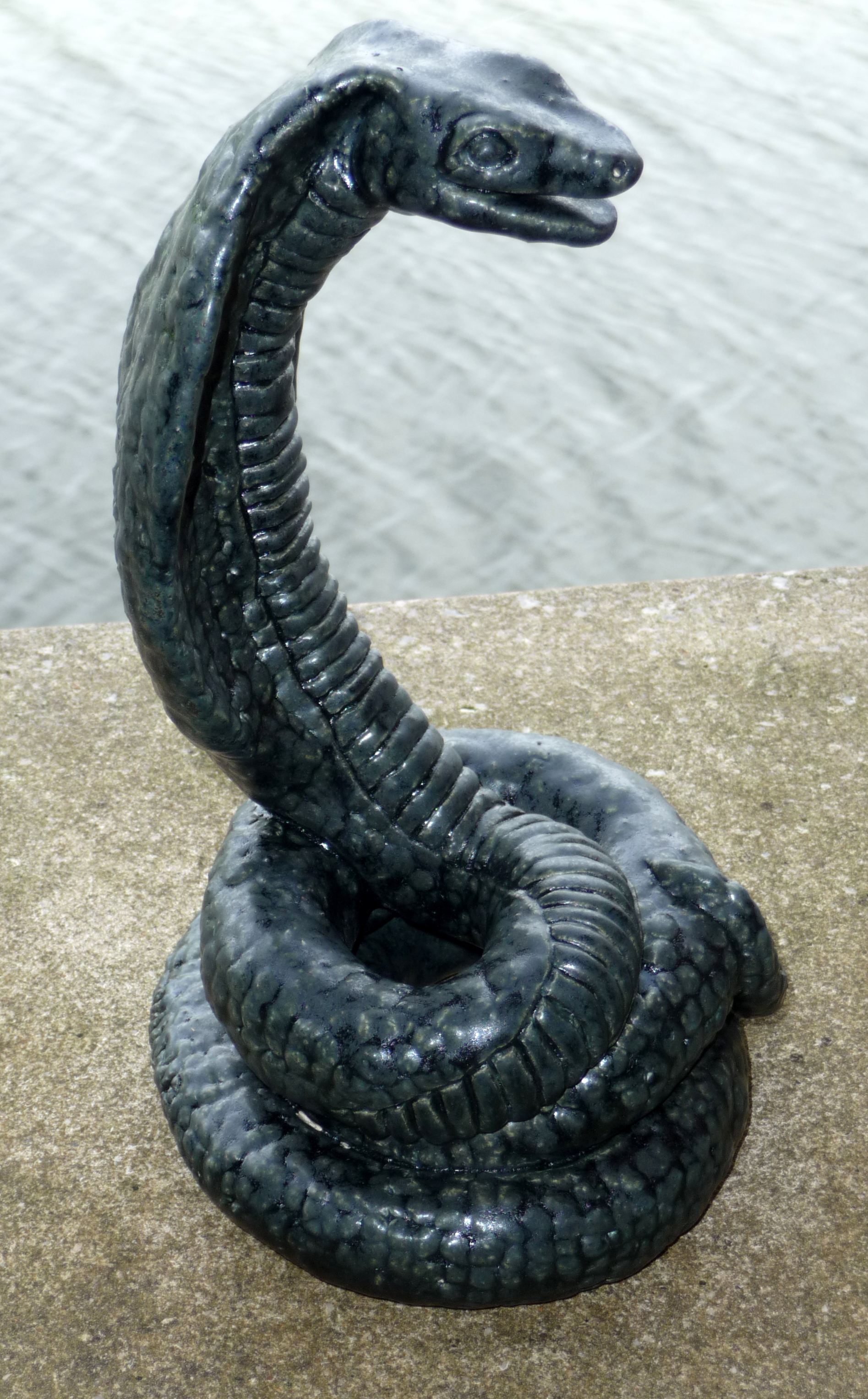 handgevormd beeld, klei, gestookt op 1220º(weerbestendig), geglazuurd blauw/groen/zwart, zijdeglans