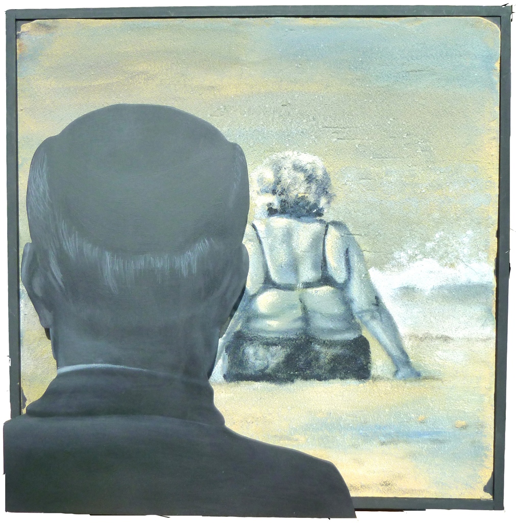 Vier vrouwen aan zee. Hun lichamen zijn rond, vol, vrij. Ze claimen de ruimte met gemak, zonder excuses. Hun blikken zijn afwezig of euforisch, nooit vragend. Ze zíjn er gewoon. Maar voor elk lichaam staat een silhouet. Steeds opnieuw een zwarte vorm, starend. Soms man, soms vrouw — altijd toeschouwer, altijd buiten beeld. Of juist: ín beeld gebracht als toeschouwer. Hoe verandert een beeld zodra er een silhouet naast staat. Deze reeks draait de rollen om: het zijn niet de lichamen die bekeken worden, maar de kijker zelf die wordt neergezet.
