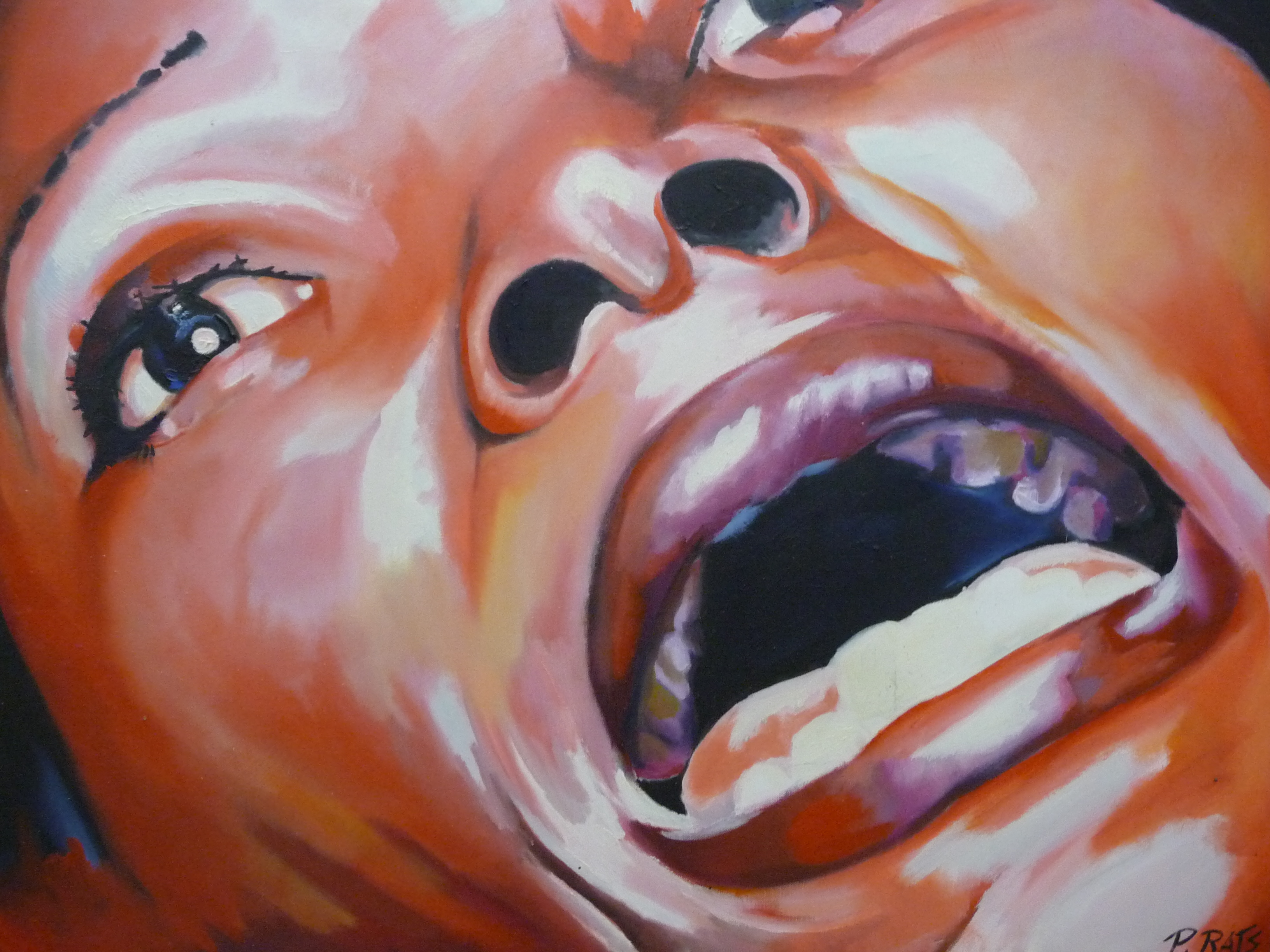 Realistisch schilderij van een schreeuwende vrouw in close-up.