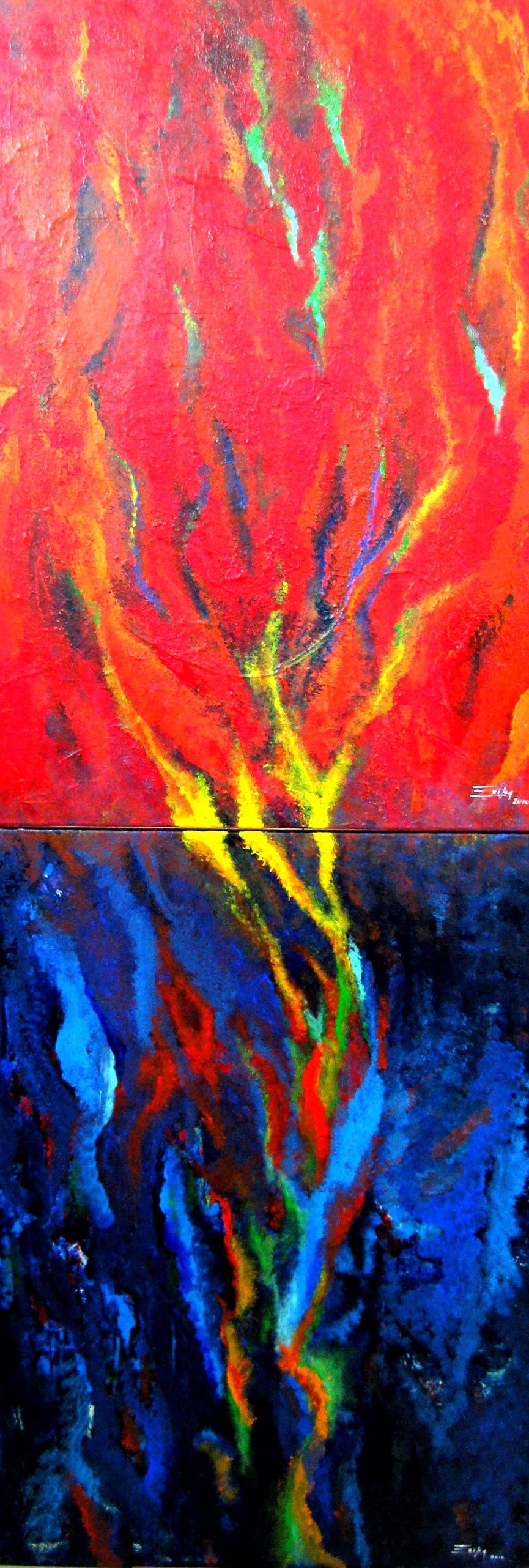 “Ik heb BEGEERTE abstract geschilderd als tweeluik: 'Begeerte van Rood' naar ‘Begeerte van Blauw’, om levenservaringen objectief en vrij van emoties waar te nemen. Rood begeert blauw, blauw begeert rood. Waarom begeren ze elkaar? Om een eenheid te vormen in paars? Zelfs kleuren hebben grenzen; is vermenging te sterk dan worden ze vuil. Met geel ontstaat de drieklank van primaire kleuren waaruit het gehele kleurenspectrum zich openbaart” Erika – aug. 2010