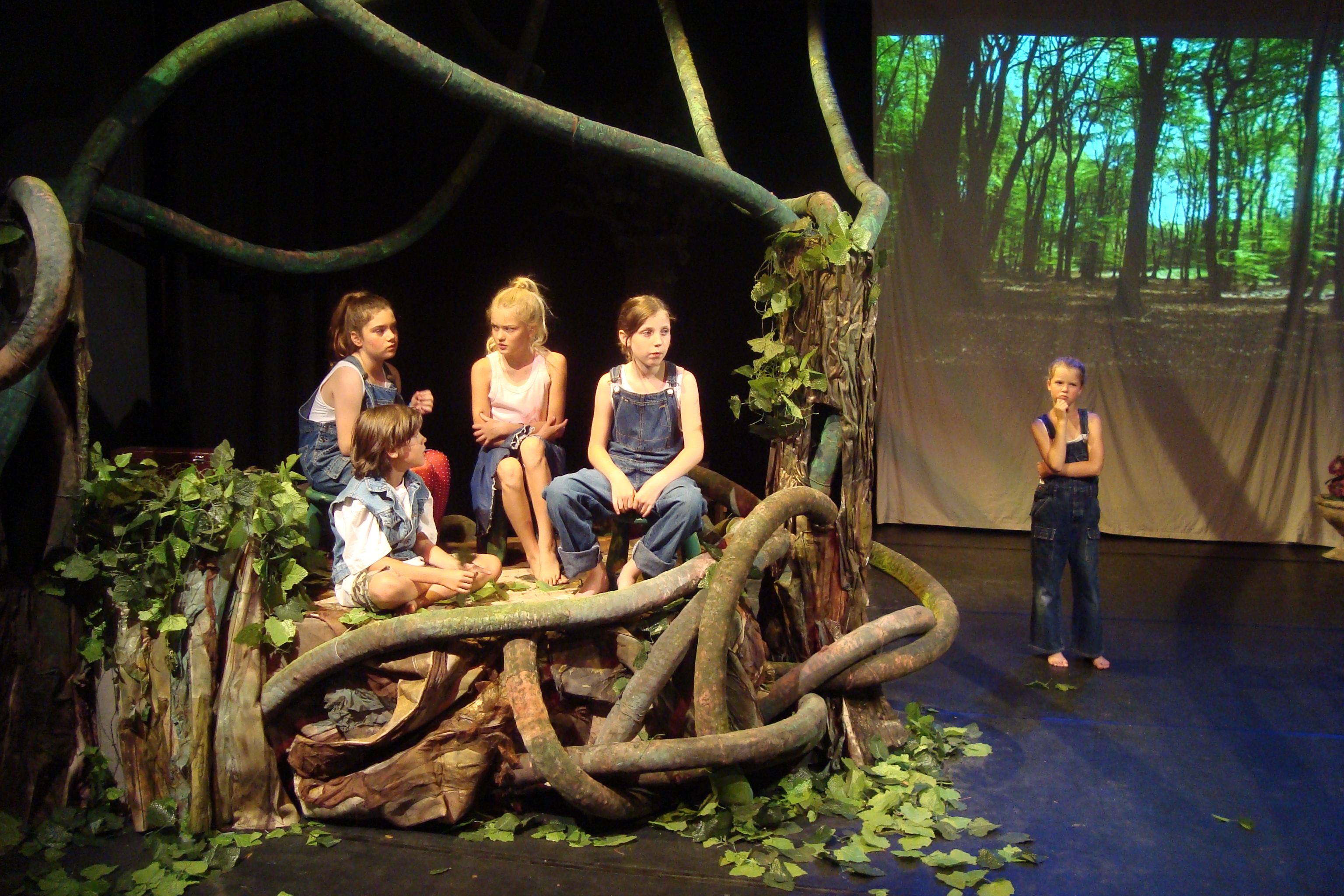 Kinderen tussen de 6 en 9 jaar spelen een toneelstuk, die zich afspeeld in de jungle.