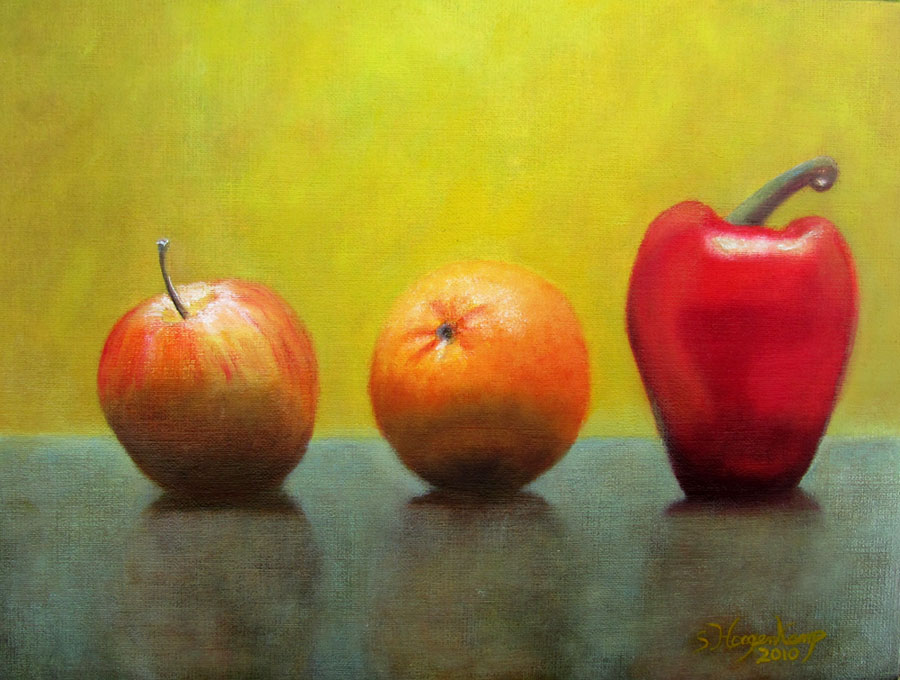 Mijn schilderijen zijn over het algemeen realistisch en geschilderd naar ideeen uit de zeventiende eeuw. Met de gebruikte techniek ontstaat laag voor laag het schilderij. Deze methode geeft veel dieptewerking en samen met een modern kleurgebruik ontstaat een bijzonder resultaat. Ik maak met deze methode stillevens en portretten. Naast deze realistische schilderijen maak ik ook grote kleurrijke abstracte composities, soms met behulp van de dripping methode.