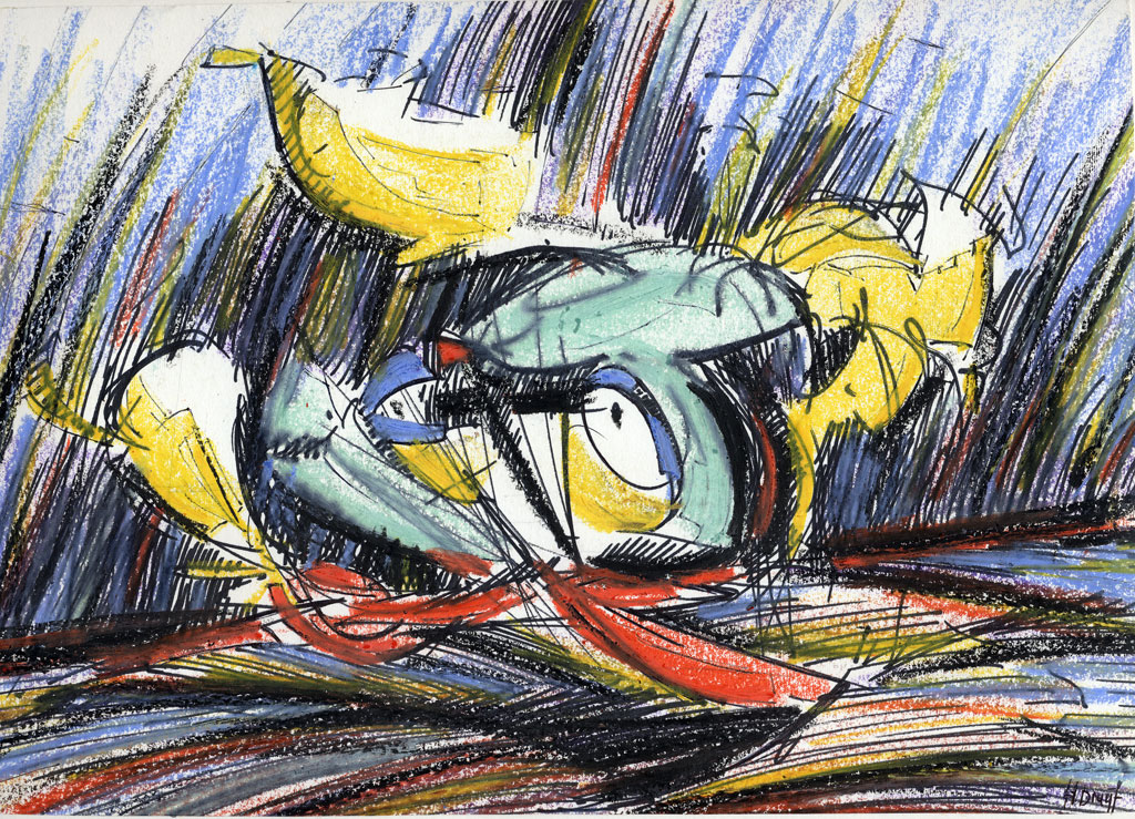 Vreemd wezen. Ingelijst met passepartout achter glas 35 cm cm hoog en 45 breed