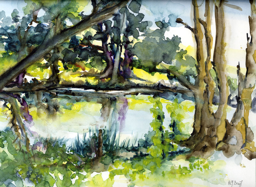 Aquarel bosvennetje in Frankrijk, ingelijst met passepartout achter glas. 47 cm hoog en 57 cm breed.