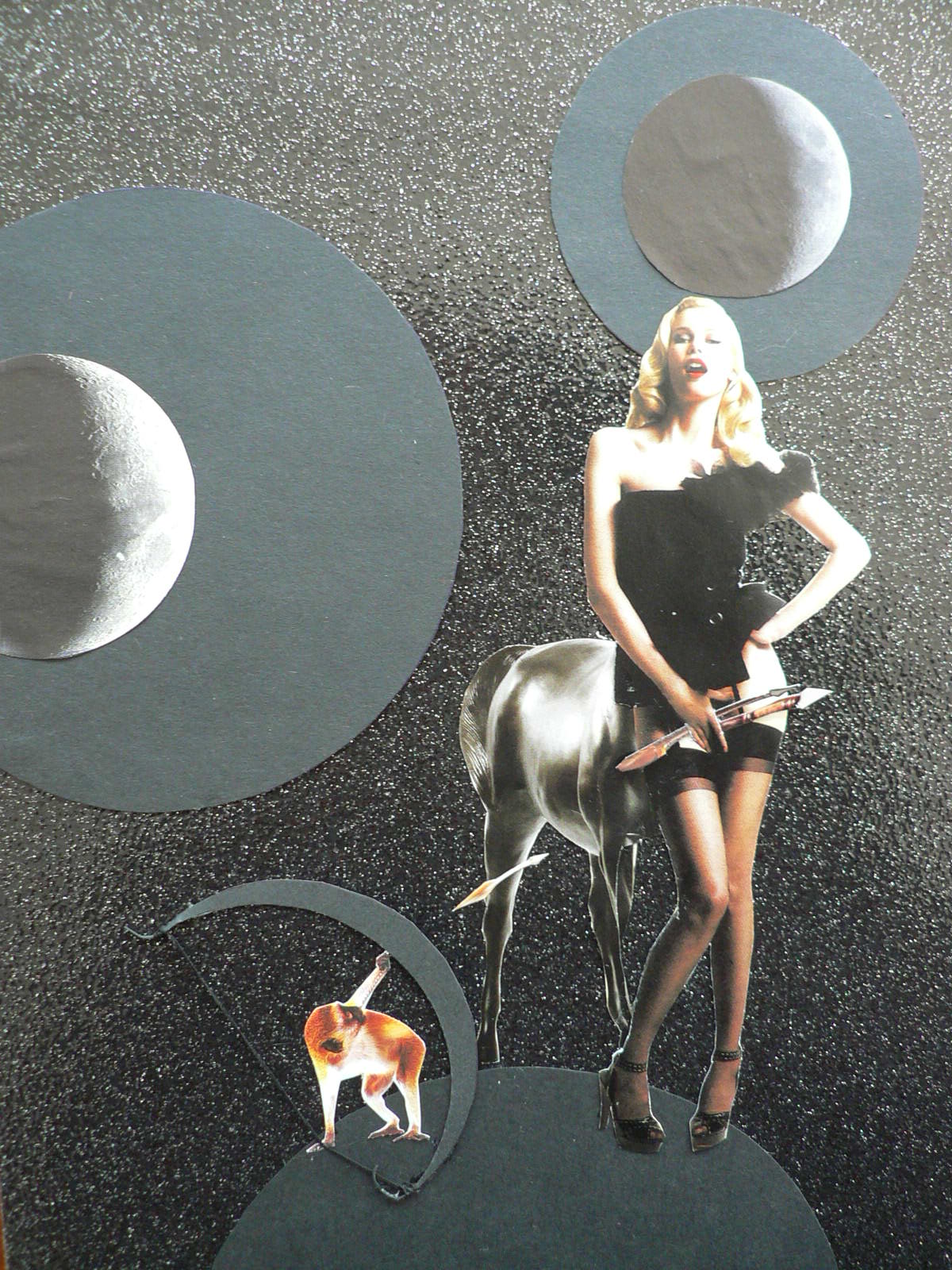 dit is een surrealistische collage gemaakt voor het sterrenbeeld 'boogschutter'. de vrouw staat op een planeet in het heelal en een aapje schiet pijlen naar haar,die ze vervolgens opvangt in haar hand. het staat symbool voor het sterrenbeeld dat tussen de mensenwereld en dierenwereld in leeft. dit sterrenbeeld behoort onder de dierenriem dat wordt gesymboliseert door het aapje. liefde speelt ook een belangrijke rol en dat wordt weer vertaald in het soort cupido tafereel, het afschieten van liefdespijlen.