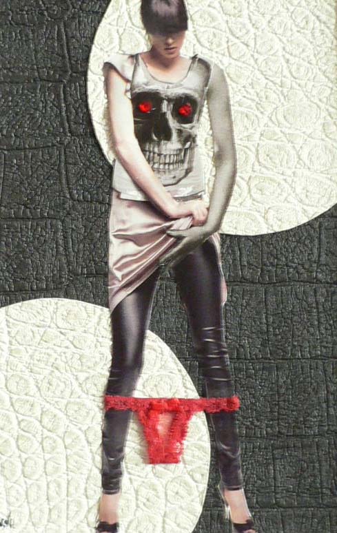 deze collage is gemaakt voor de expositie die ik organiseerde genaamd 'the dirty dutch show' wat een nederlandse versie was van de amerikaanse 'dirty show' . een expositie met als thema erotiek. deze afbeelding heeft dan ook een erotische lading met het rode slipje wat op haar knieeen hangt als ze haar rokje optilt.