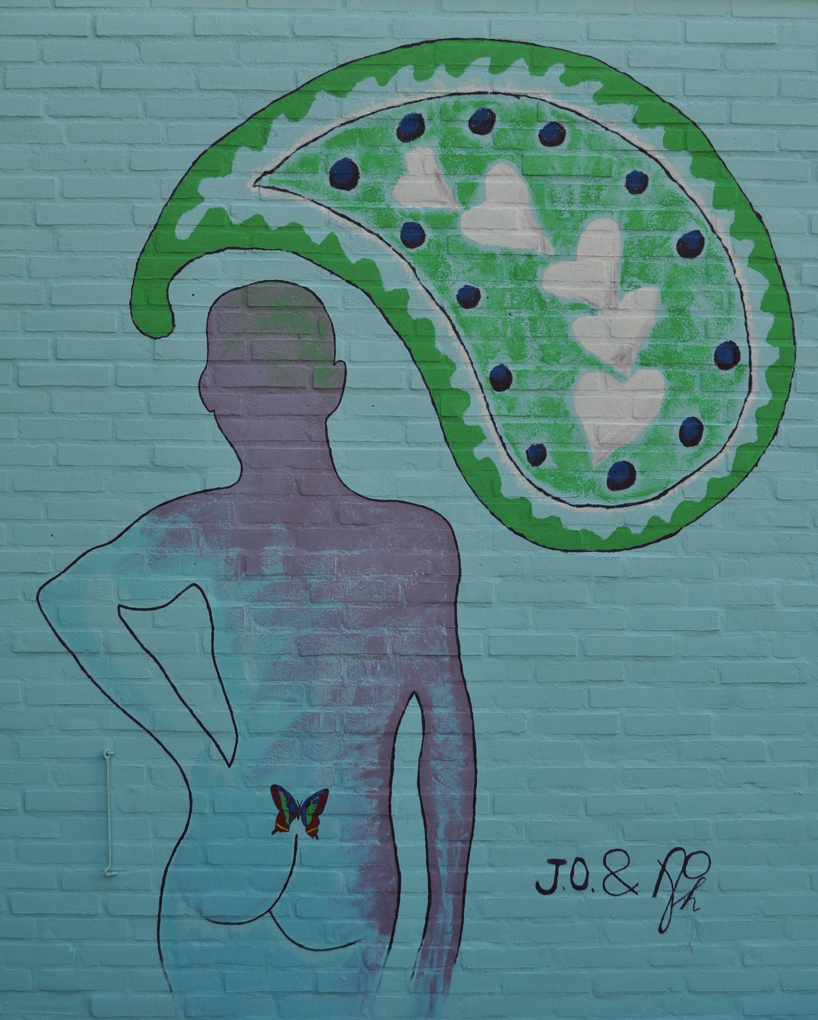 Samenwerkingsproject met Jorien van der Gaag (Kunstenares uit Vlaardingen). Geschilderd op een muur in een Vlaardingse tuin