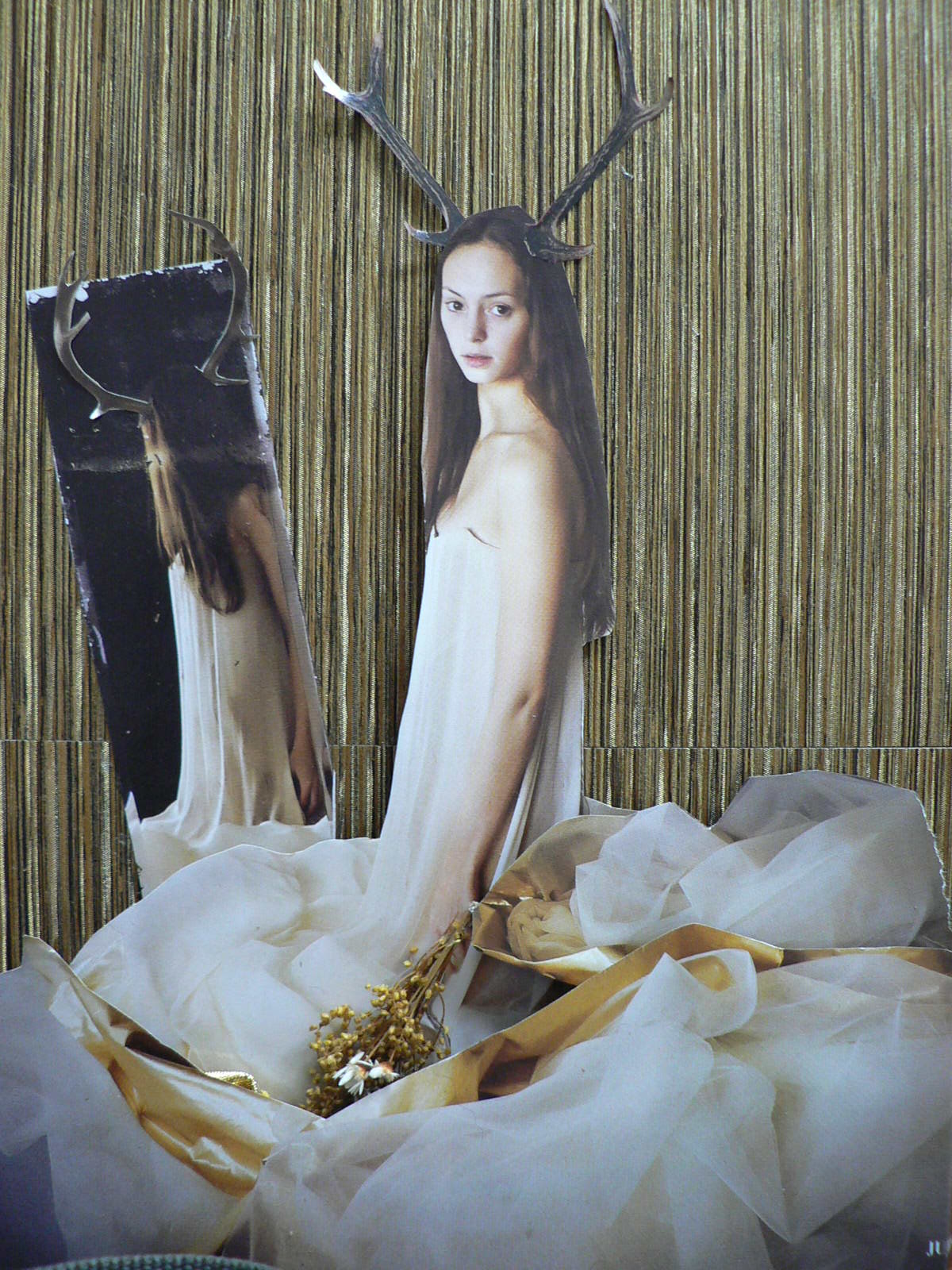 dit is een assemblage 'schaduwkastje' met een uitbeelding van het sterrenbeeld 'steenbok', de vrouwelijke steenbok is uitgebeeld als kalm, trouw, rustig en voelt zich beter niet omringd door mensen maar alleen met zichzelf (ze houdt zichzelf gezelschap in de spiegel).