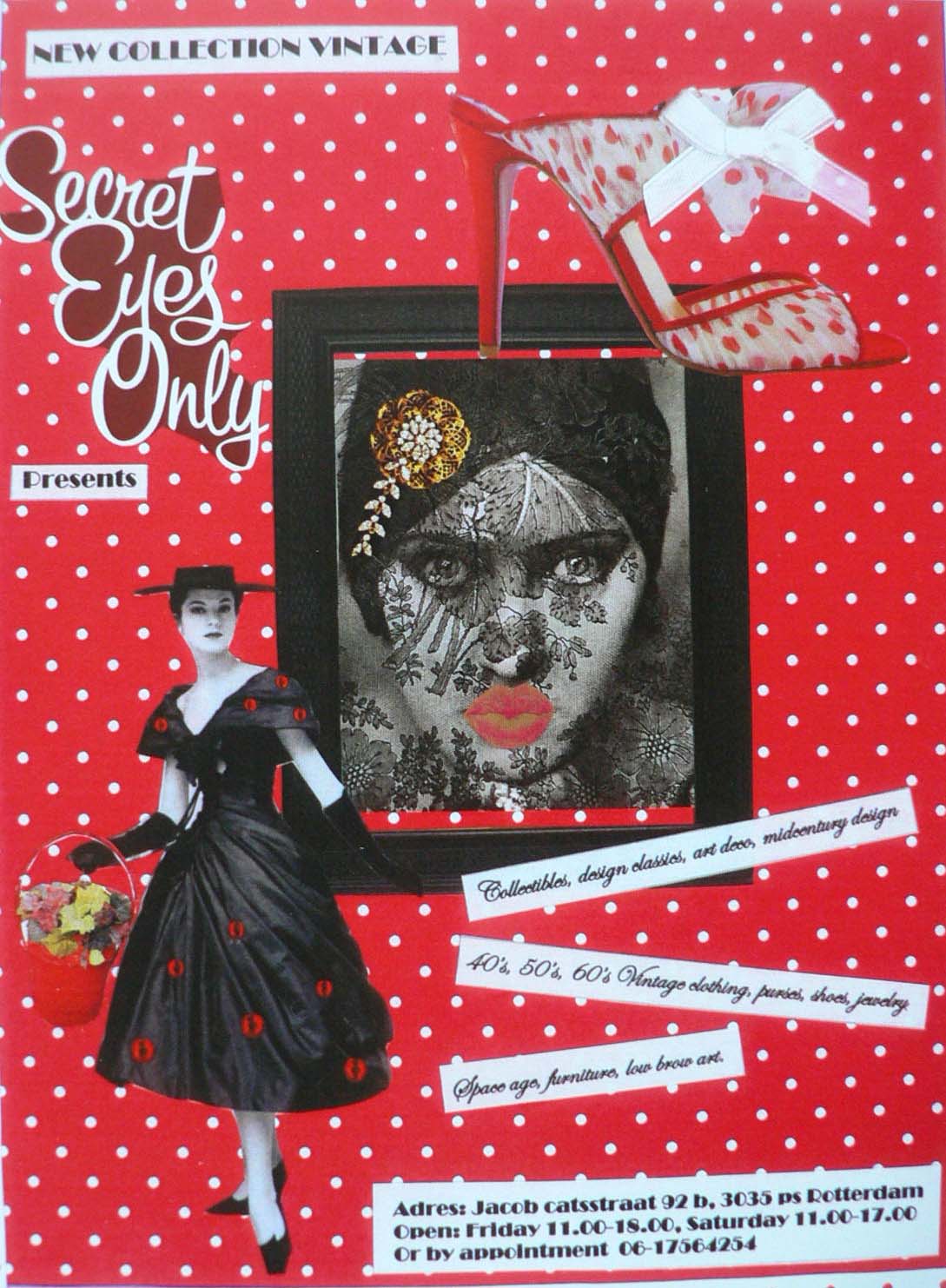deze collage is gemaakt voor een reclame flyer voor vintage winkel 'secret eyes only'. voor de nieuwe collectie vintage diende een flyer gemaakt te worden die de klanten er op attent zou maken dat er een nieuwe collectie vintage te koop was. de sfeer van de flyer moest een vintage retro gevoel uitstralen met een aantal vintage artikelen die dat gevoel benadrukken. ik heb in deze flyer gekozen voor een vrouwelijk rood met wit polkadot motief als achtergrond en bewerkte vintage fotos.