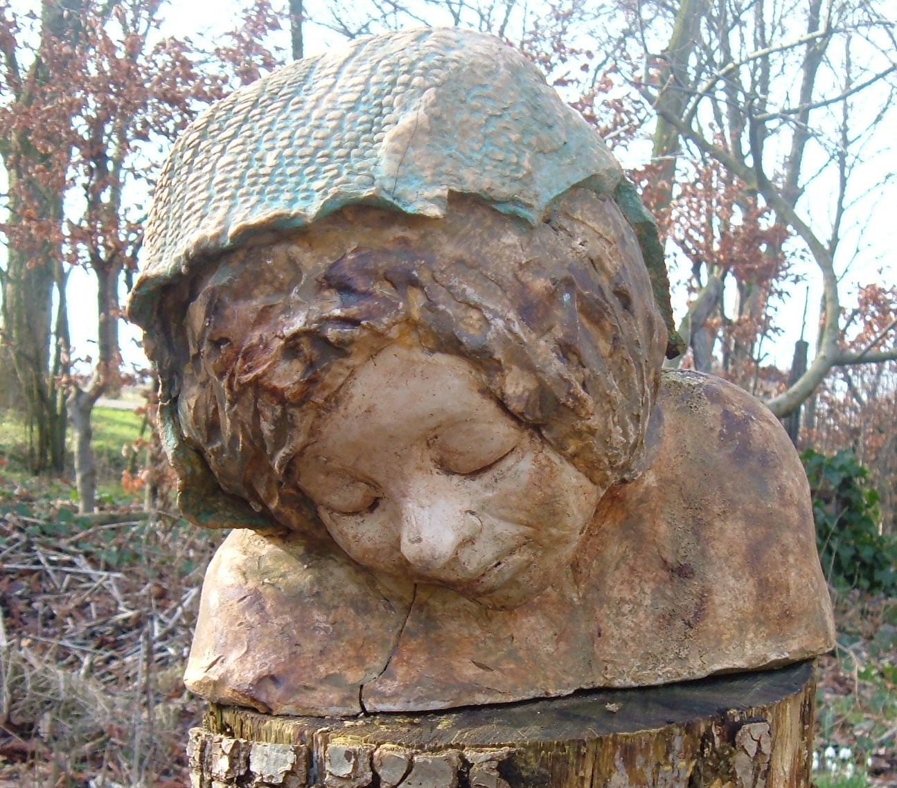 Witte fijne chamotteklei, gekleurd met mangaanoxyde en groen pigment. Gedeeltelijk geglazuurd. Op sokkel van boomstam.