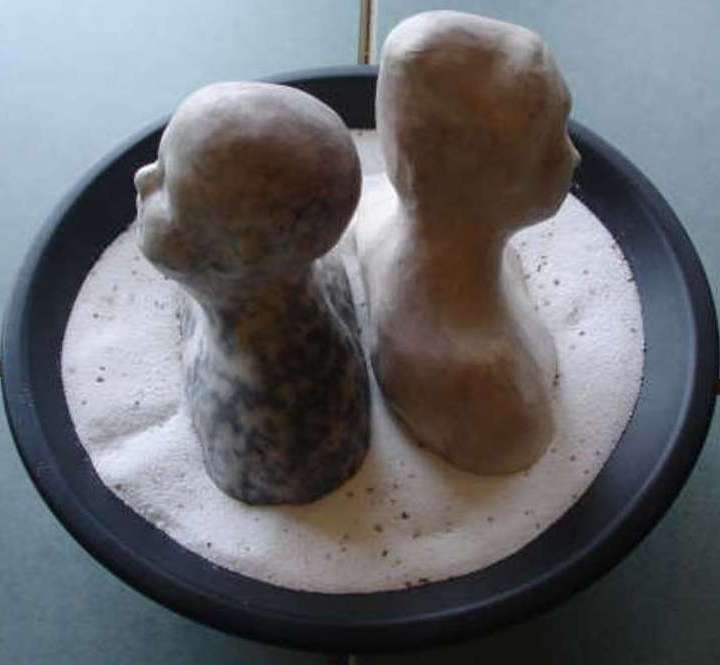 Twee gepolijste beeldjes in schaal, waarvan één naked raku gestookt.