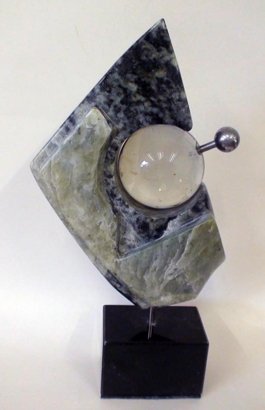 Evenwicht , een beeld van speksteen,glas en roestvrijstaal