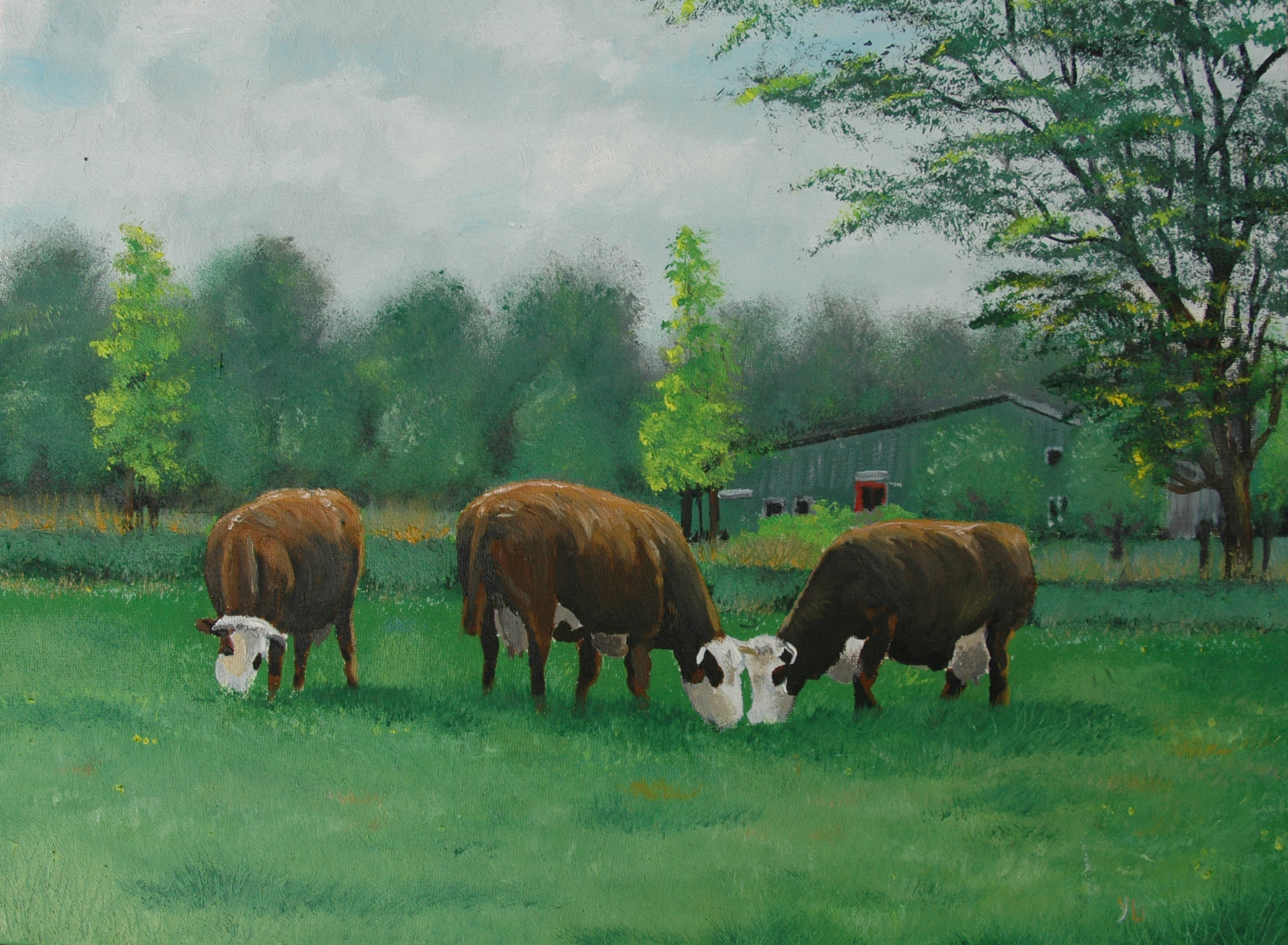 Landschap Groen Realistisch Olieverf Bomen Koeien Gras Weiland Schuur