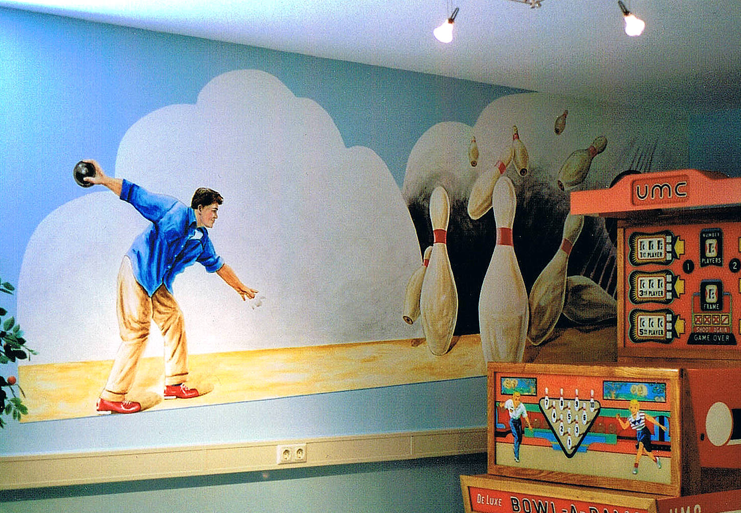 Opdracht, wandschildering, decoratie fantasie bij een speelautomaat , een bowlingbaan uit de vijftiger jaren. Moderne bowling van het spel met tien kegels ontwikkelde zich in de Verenigde Staten in de 19e eeuw.