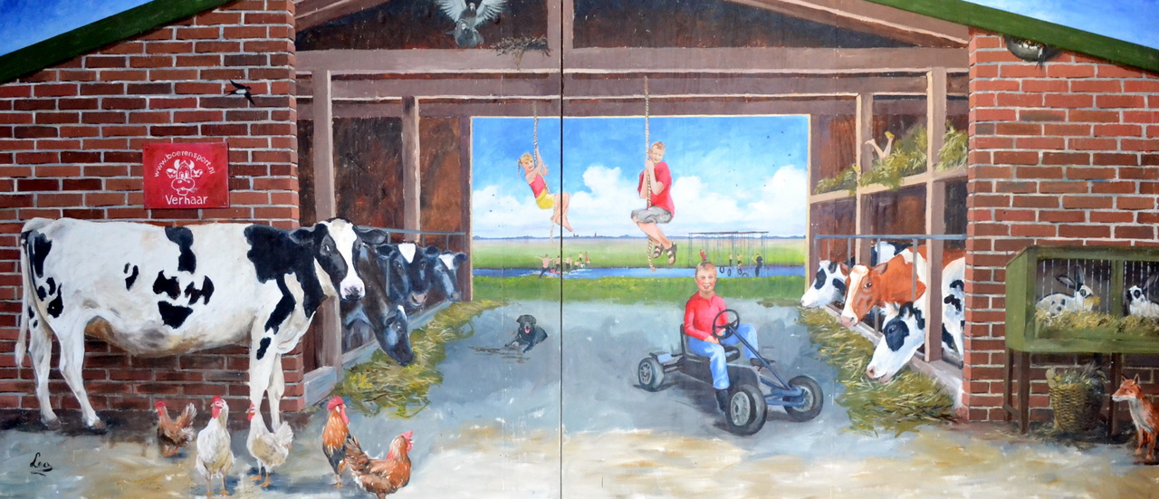 Boerensport Verhaar heb ik gemaakt voor Willy Verhaar. Zij is een goede kennis van ons. Dit schilderij is gemaakt op twee afscheidings schermen, en doet dienst op de boerderij, waar van alles te doen is.