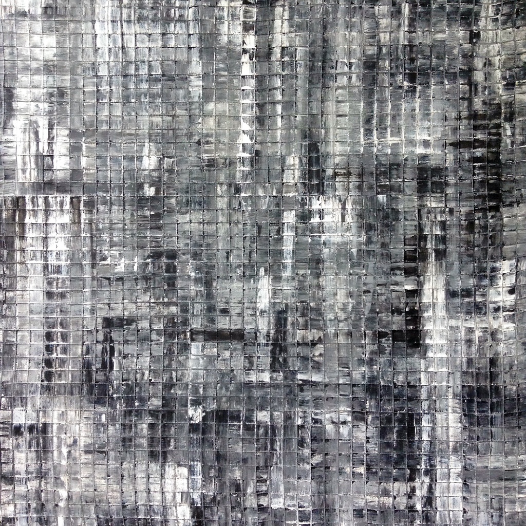 Ontkoppeling. De wereld is zwart wit als de mensen geen verbinding met elkaar hebben en allemaal in hokjes leven. Dan is er geen veelkleurigheid en liefde meer in de wereld. Acrylverf op een linnendoek dat gespannen is over een houten frame.