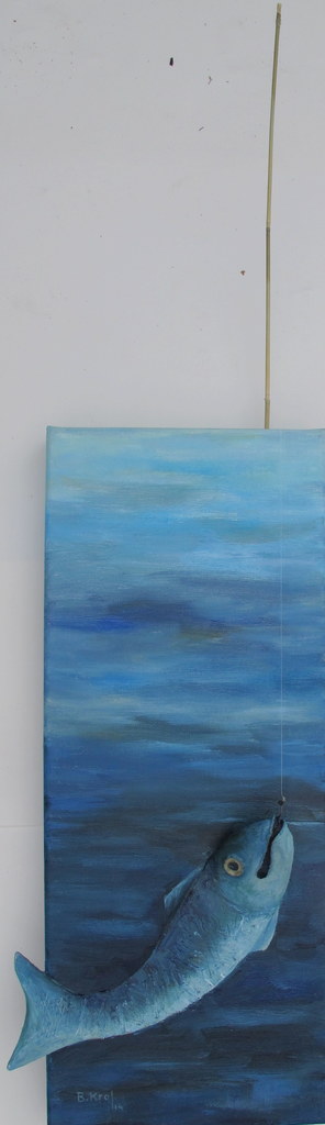 Extra dimensie toegevoegd door een vissekop en stukje staartvin uit het werk naar voren te laten komen en een hengeltje toegevoegd
