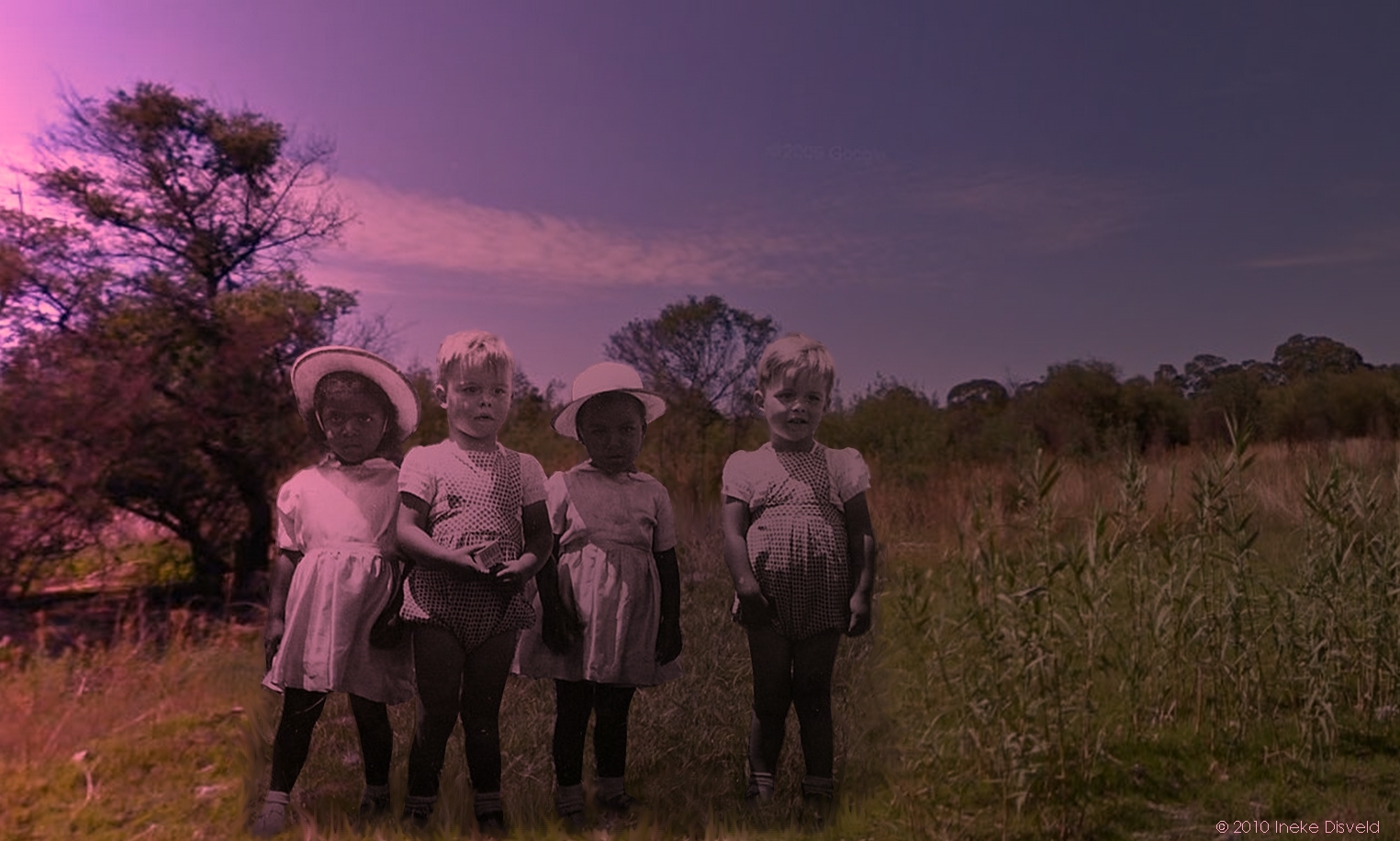 In het veld achter het witte huis staan mijn tweelingbroers met twee buurmeisjes, verweven in het heden.