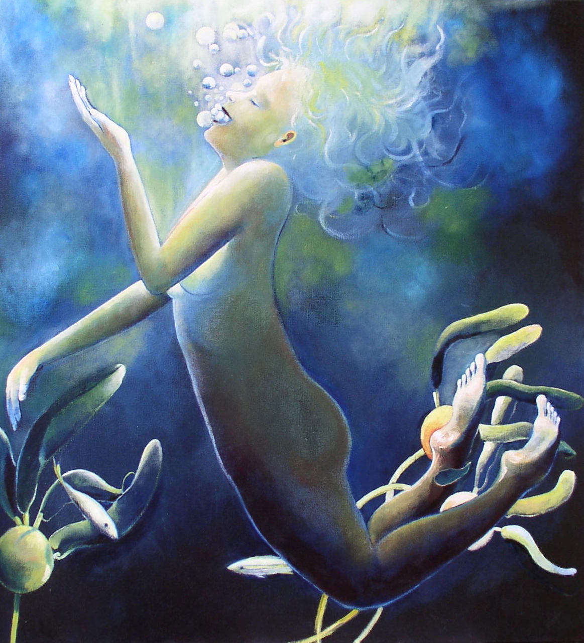 Wit Geel Mystiek Spiritueel Goud Groen Vrouw Water Genietend Sfeer Vissen Wereld Drijven Planten Zalm Zwemmen Duiken Noorderlicht Sereniteit