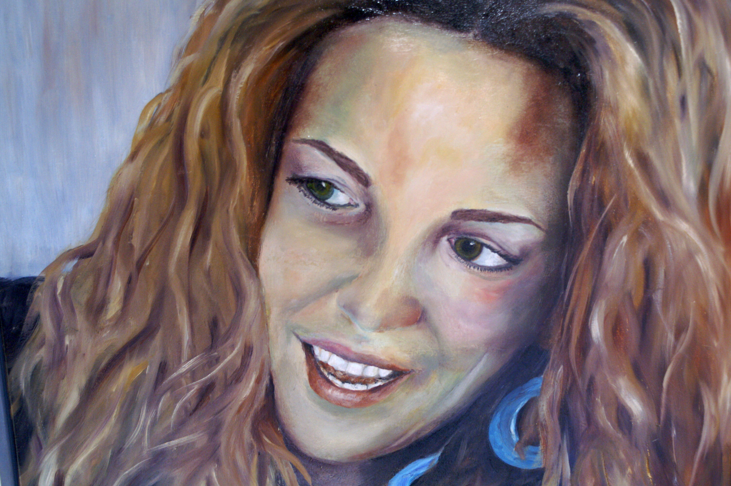 Onze jongste dochter, terwijl ze vertederend opzij kijkt naar haar dochter, die voor haar op de tafel ligt.