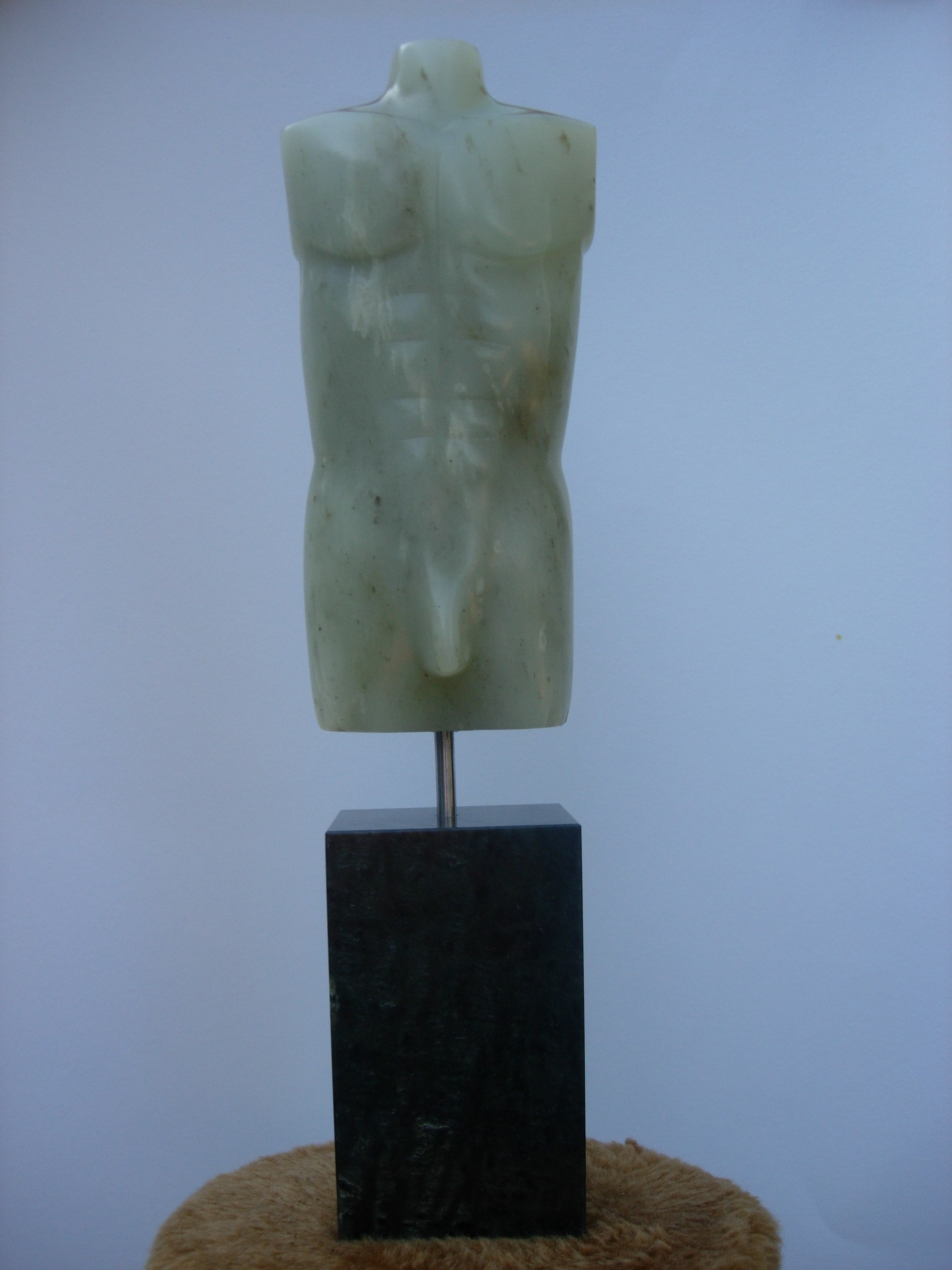 Torso is een mannelijk beeld van groene speksteen op een zwarte granieten sokkel.