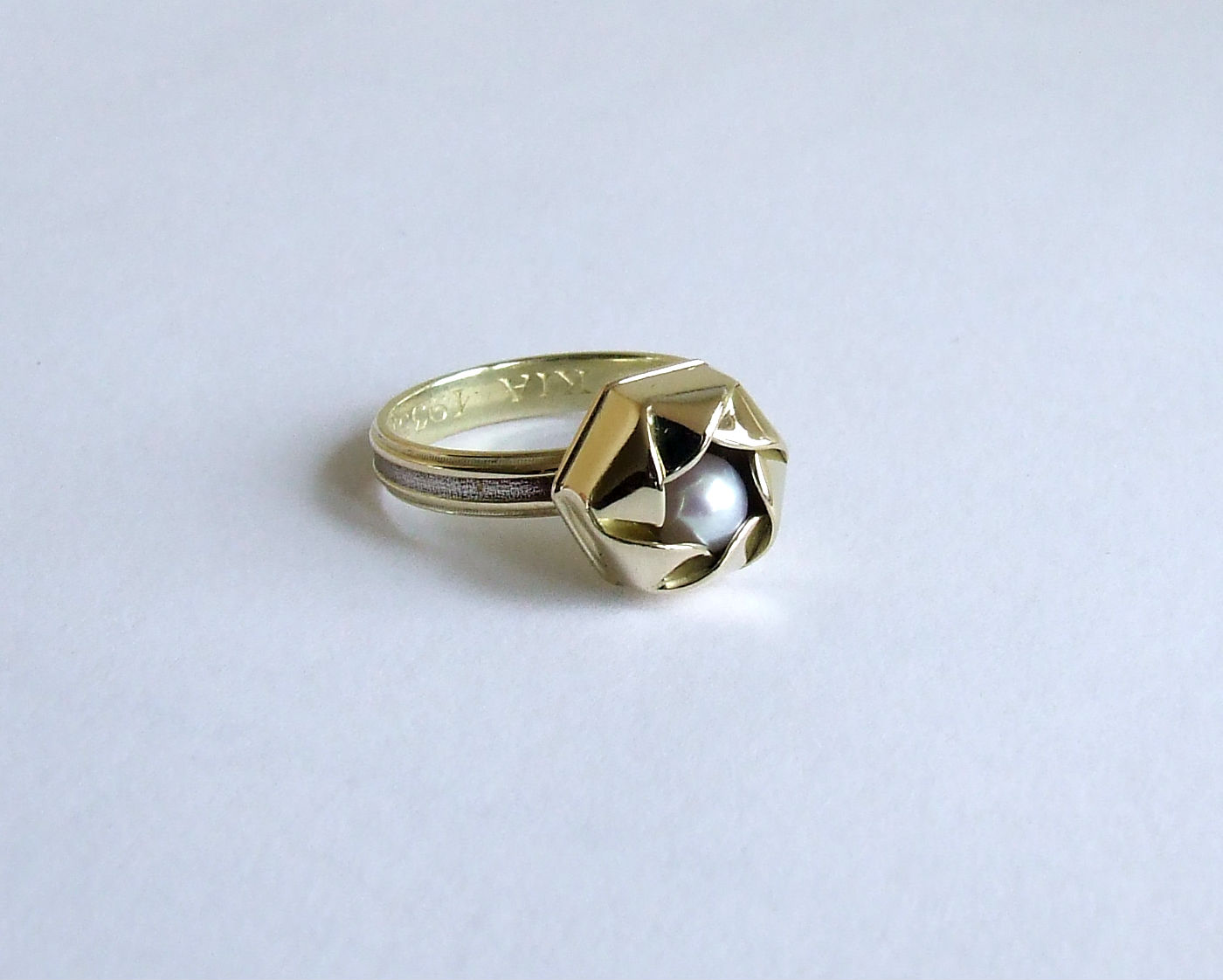 Gouden sieraad gemaakt op bestaande trouwring. In de kroon kan een parel vrij bewegen. Ontworpen samen met de grotere rolling stones 17. Hoogglans gepolijst. (ontwerpopdracht S1107A)