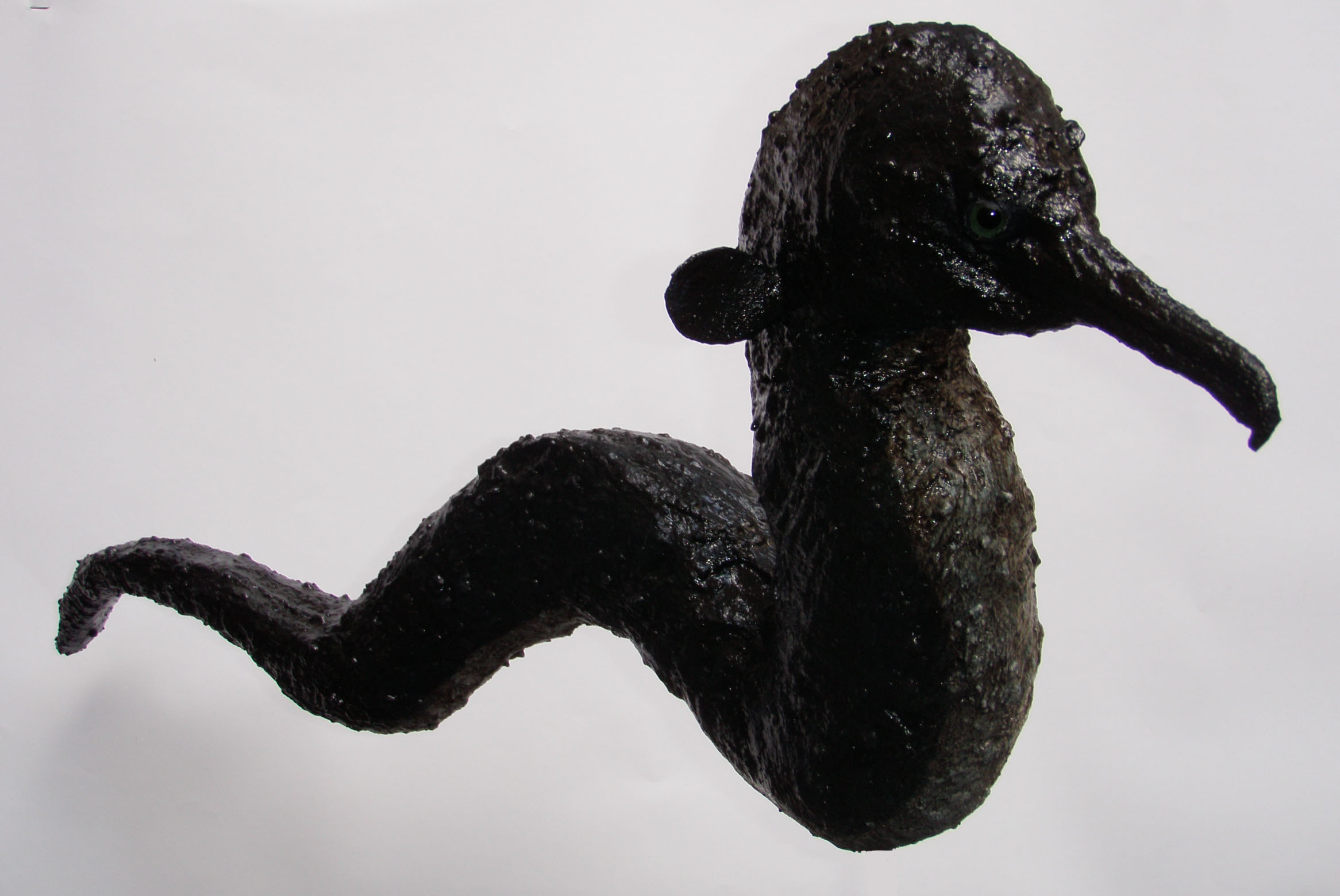 Een paling met de kop van een aalscholver, maar dan wel met kieuwen. Beeld staat op een standaard.